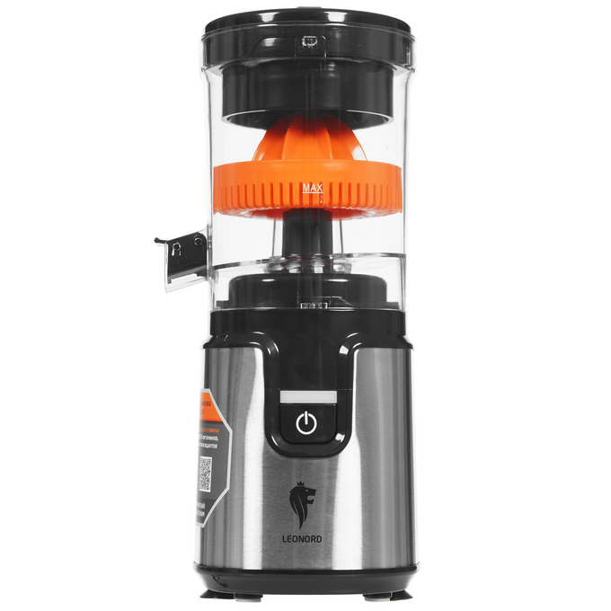 Соковыжималка электрическая Leonord LE-1781 в корпусе из металла и пластика серебристого цвета имеет прорезиненные ножки для устойчивой фиксации на кухонной поверхности. Модель подходит для отжима сока из цитрусовых. Управление прибором производится путем нажатия на одну кнопку.
