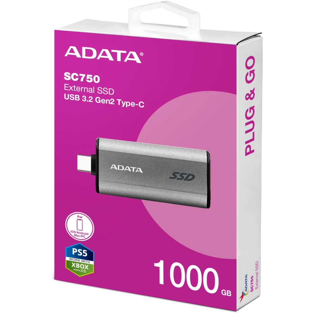 SSD A-DATA SC750 (SC750-1000G-CCBK), External, 1TB USB 3.2 Gen 2 Type-C, R/W -1050/1000 MB/s серый