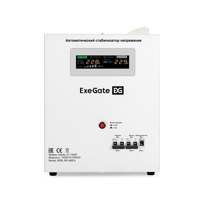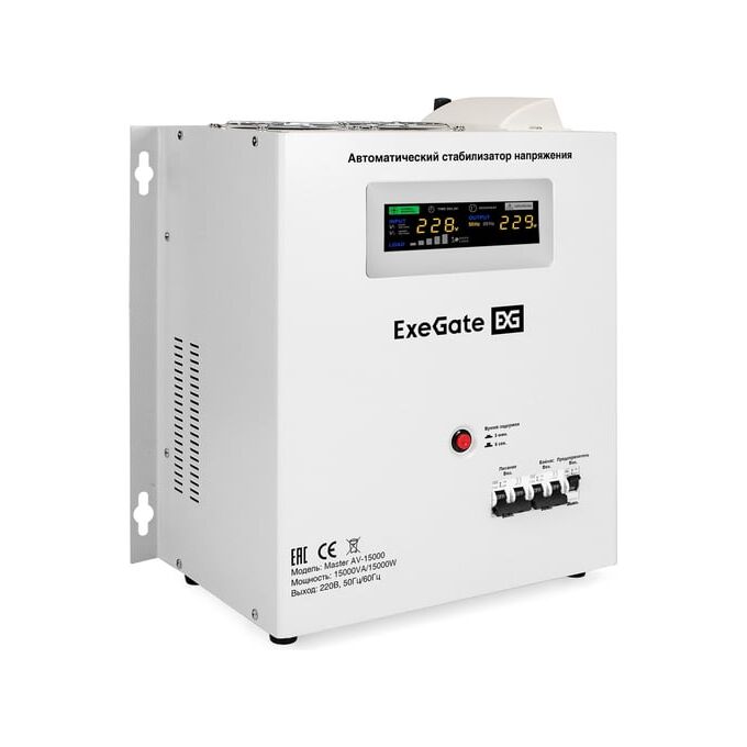 Стабилизатор напряжения Exegate Master AV-15000 EX291764RUS настенный 15000ВА, вход 140-260В, цветной дисплей, выход 220В±8%, КПД 98%