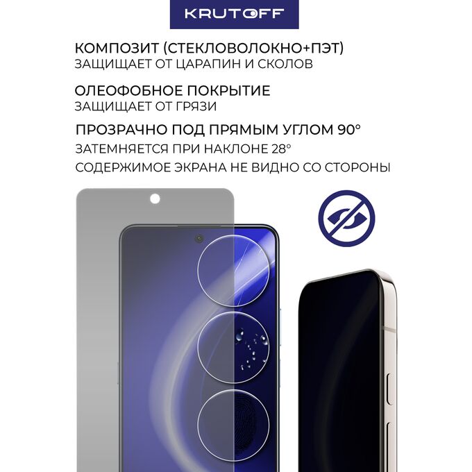 Сохранив гибкость защитной пленки, гибридное стекло намного удобнее обычного закаленного стекла - как при транспортировке, так и при установке. Оно тоньше, прочнее и надежно защищает экран от повреждений. Стекло антишпион не только защитит телефон от механических повреждений, но и скроет экран вашего смартфона от любопытных взглядов. Благодаря специальному свойству, изображение на экране видно только под прямым углом. Со стороны экран будет выглядеть как при выключенном дисплее. Стекло имеет отступы по 1 мм от края дисплея для удобства ношения защитного чехла. Имеет высокую степень устойчивости к царапинам, обеспечивает хорошую чувствительность к касанию и не влияет на сенсорный отклик по всей поверхности дисплея. Гибридное стекло идеально прозрачное, не снижает четкость и яркость изображения, не меняет оригинальную цветопередачу экрана. Изготовлено из гибкого композиционного материала (стекловолокно и ПЭТ). Является гибким и не растрескивается, а края не крошатся, как у обычного закаленного стекла. Защищает от пыли, грязи, брызг и царапин. Верхний слой из стекловолокна по тактильным ощущениям близок к стеклу и не влияет на работу сенсора по всей поверхности экрана. Полная проклейка поверхности (Full Glue). Специальная смесь высококачественных клеев гарантирует установку без пузырьков воздуха и что стекло не отслоится с течением времени. Внимание! Гибридное стекло поставляется в двух защитных транспортировочных пленках (на тыльной и лицевой стороне). Данные пленки могут быть поцарапаны. После наклеивания стекла снимите защитную синюю пленку "2" с лицевой стороны!