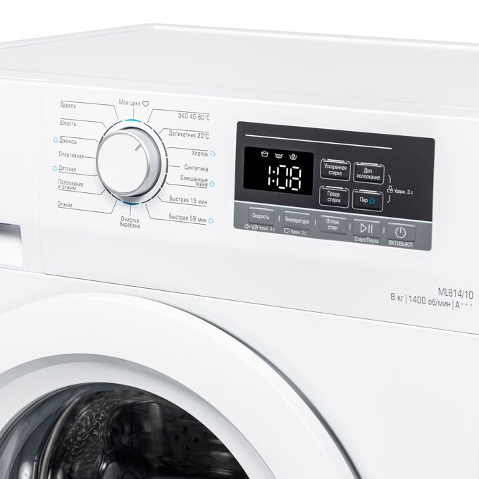 Основные программы Хлопок, Деликатная 20 ºC, Синтетика, Смешанные ткани, Шерсть, Быстрая 59/15 мин, Отжим, Полоскание и отжим