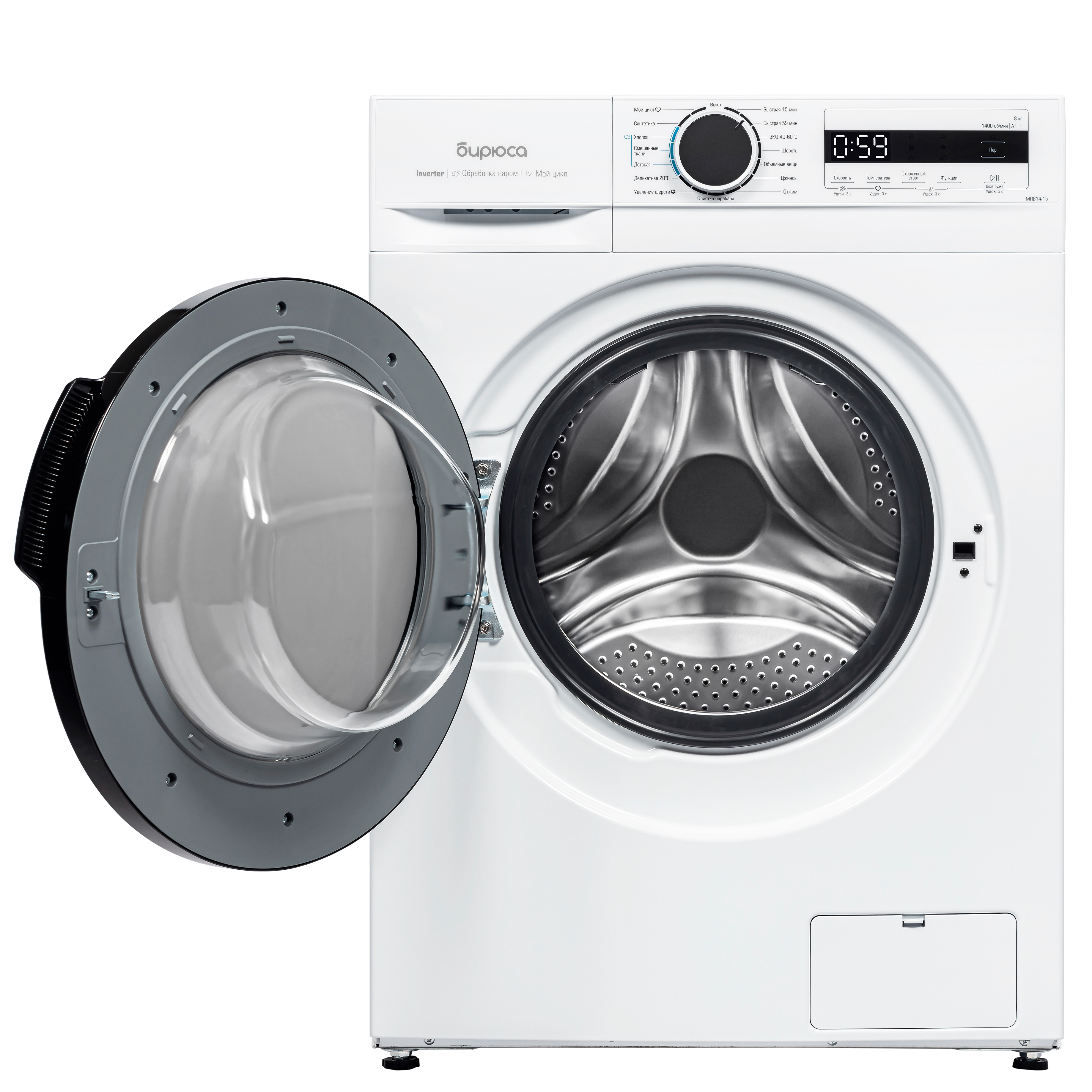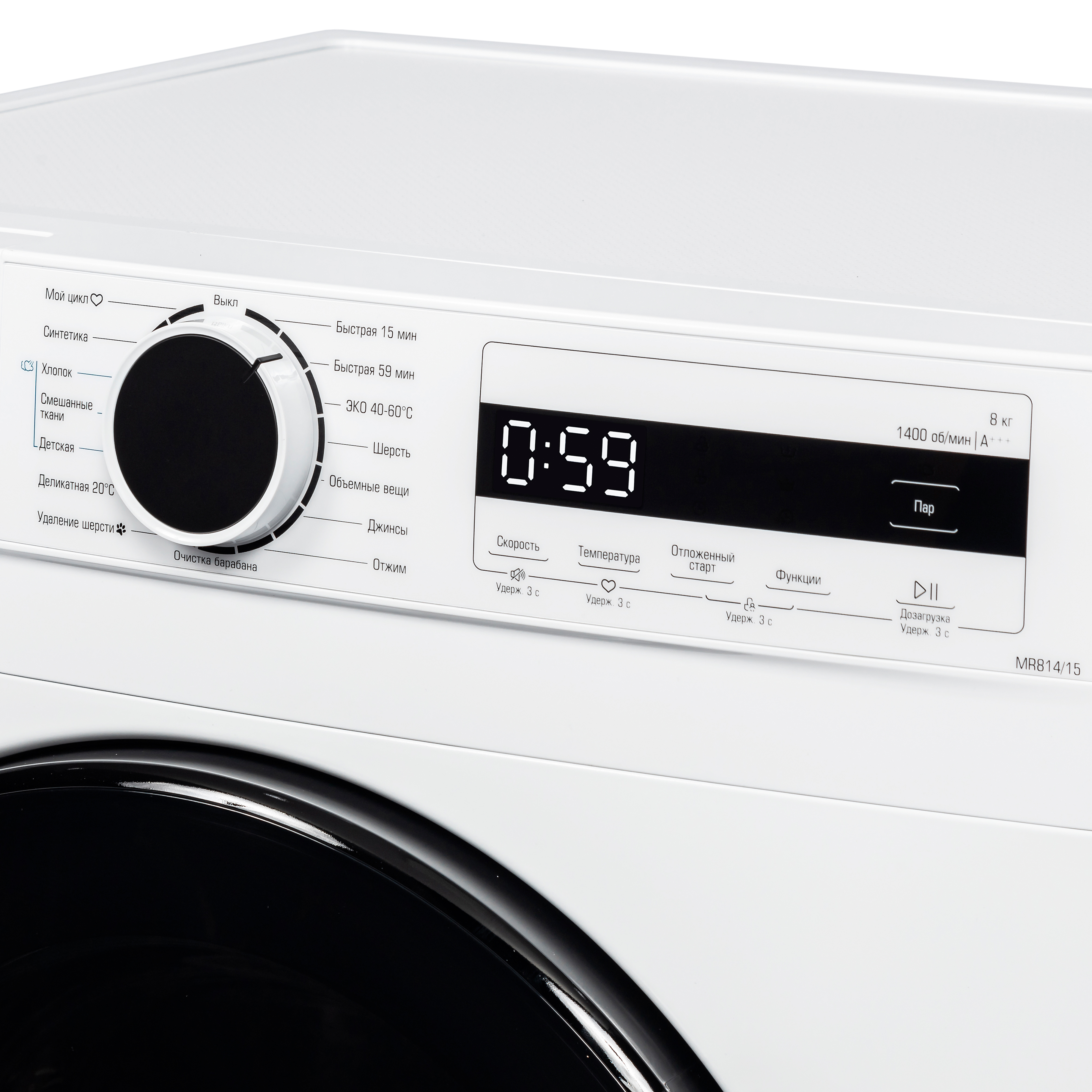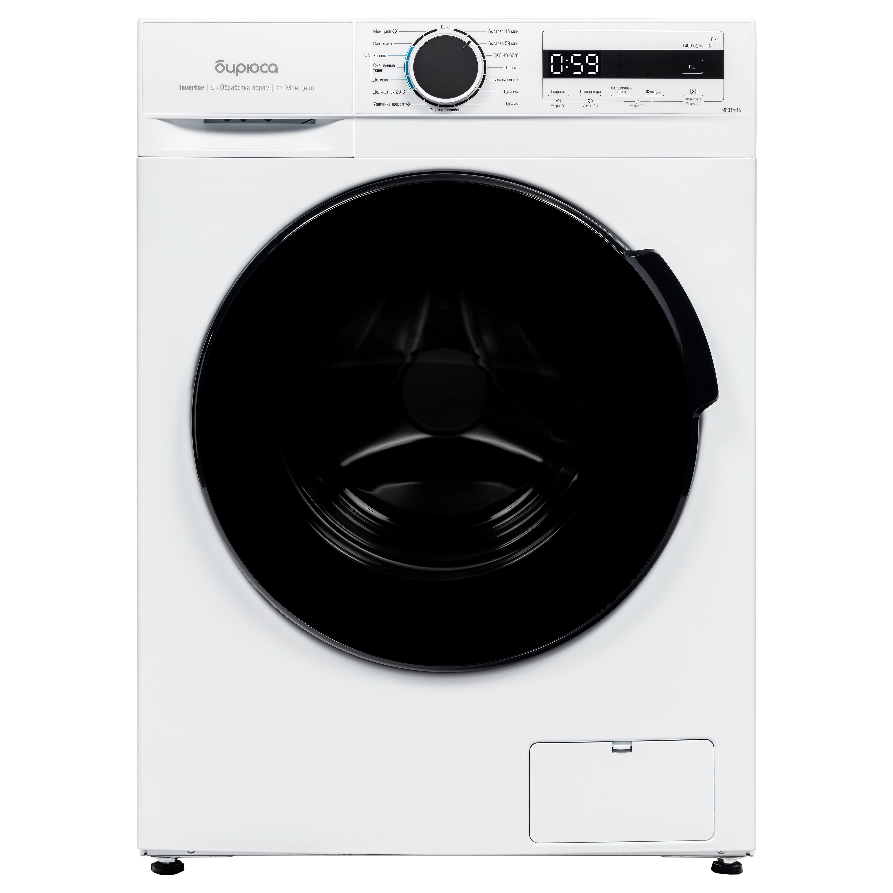 Основные программы Хлопок, Деликатная 20 ºC, Синтетика, Смешанные ткани, Шерсть, Быстрая 59/15 мин, Отжим