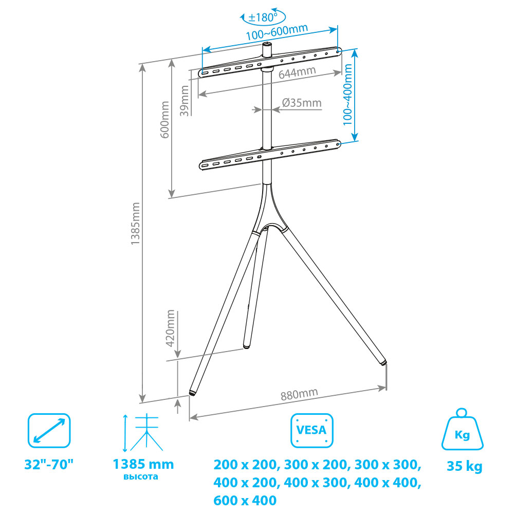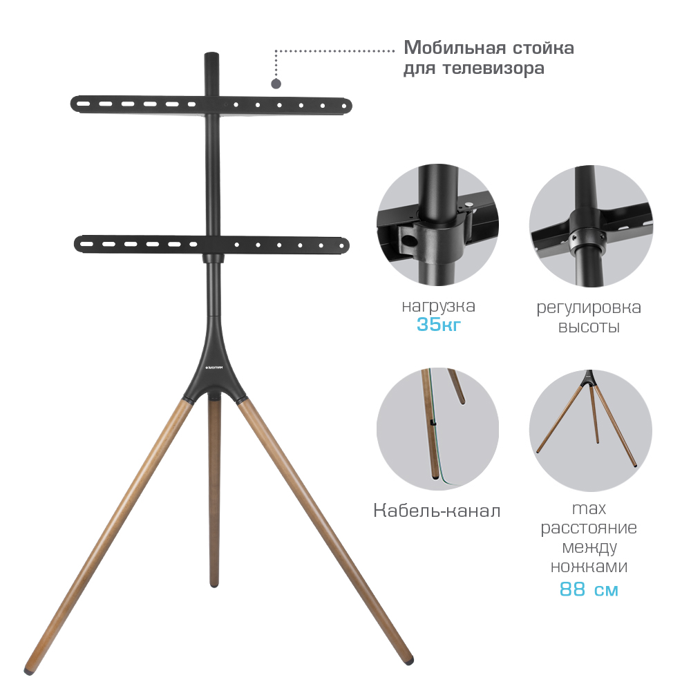 Универсальная система крепления, Надежная конструкция максимальная нагрузка до 35 кг, Резиновые накладки предотвращают скольжение и царапины на полу, Cпециальная возможность поворота , Простая установка, Кабель-канал