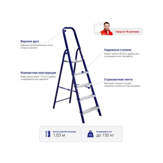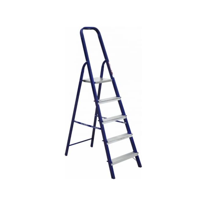 Стальная стремянка Алюмет М8305 выполнена из прямоугольного профиля и окрашена синей полимерной краской. Эта модель рассчитана на высокую нагрузку, обеспечивает хорошую устойчивость как всей конструкции, так и каждой ступеньки по отдельности. Ступени выполнены из алюминия, имеют специальное рифление, что снижает вероятность скольжения во время работы. Прочный страховочный ремень предотвращает выход стремянки из рабочего положения, что обеспечивает безопасную работу на верхних ступенях. Применяется в быту и строительной области.