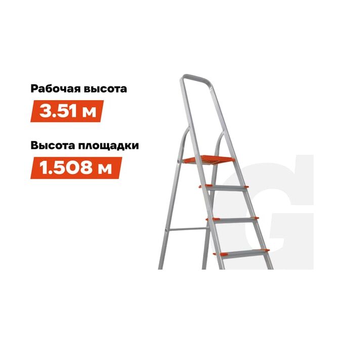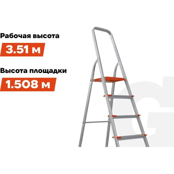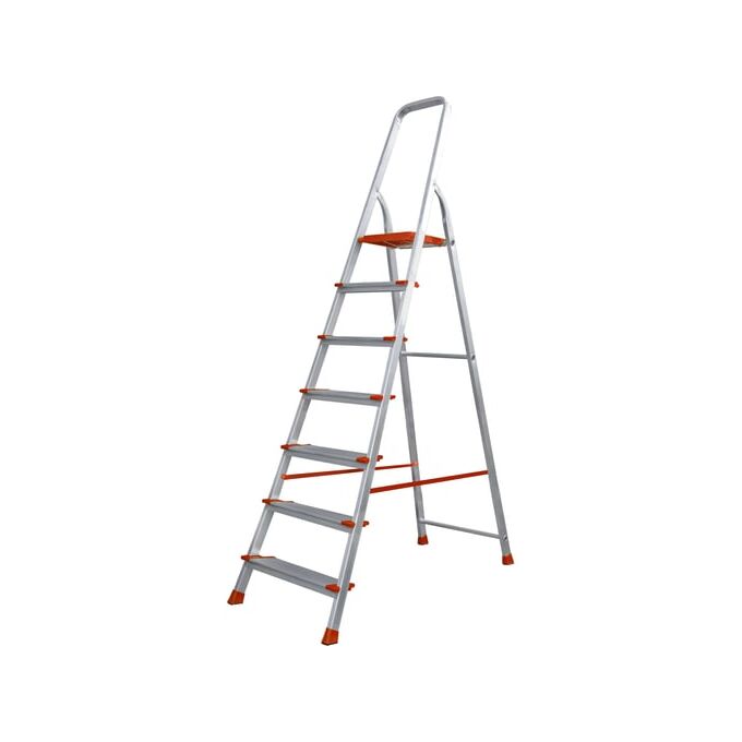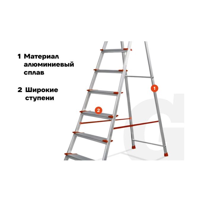Стремянка Gigant 7 ступеней с шириной 130 мм, PROFI AAA-09 имеет высокую дугу безопасности (600 мм). Cтраховочные ремни - безопасная эксплуатация. Широкие ступени глубиной 130 мм. Опорные пластиковые наконечники против скольжения. Рифленые ступени и площадка - безопасный подъём и спуск. Прочное крепление ступеней к боковинам 6 заклепками - отличная устойчивость. Cтупени и стойки изготовлены из прессованных алюминиевых профилей увеличенного сечения, площадка - из прочного композитного материала.