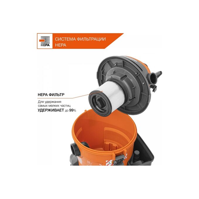 Шланг длиной 3 м позволяет собирать строительный мусор на высоте, без необходимости поднимать пылесос.