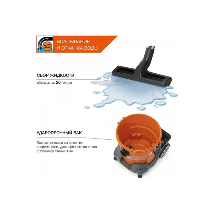 - Возможность сбора воды. Функция всасывания и откачки воды позволяет эффективно собирать жидкость с любого покрытия в объеме до20 литров.
