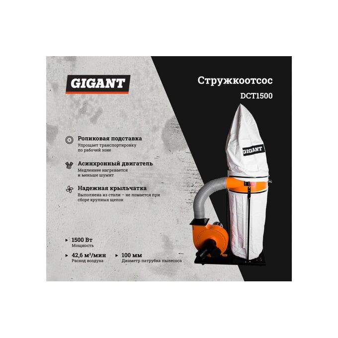 Стружкоотсос Gigant DCT1500 эффективно удаляет опилки, пыль и древесную стружку с рабочей поверхности. Модель обладает асинхронным двигателем высокой мощности. Конструкция проста в сборке и подключении, требует наличия сети 220 В. Транспортировочная подставка на роликах облегчает перемещение оборудования по мастерской.