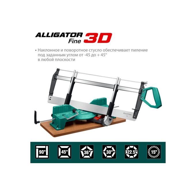 Прецизионное стусло KRAFTOOL Alligator 3D, 600 мм 15451-600 предназначено для распила потолочных плинтусов и заготовок из различных материалов под заданным углом. Поворотная конструкция облегчающей работу с заготовками из древесины и прочих материалов.