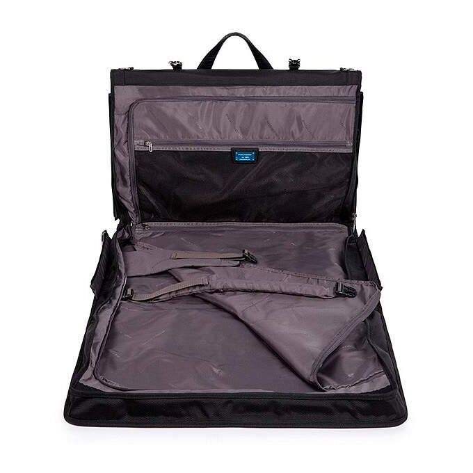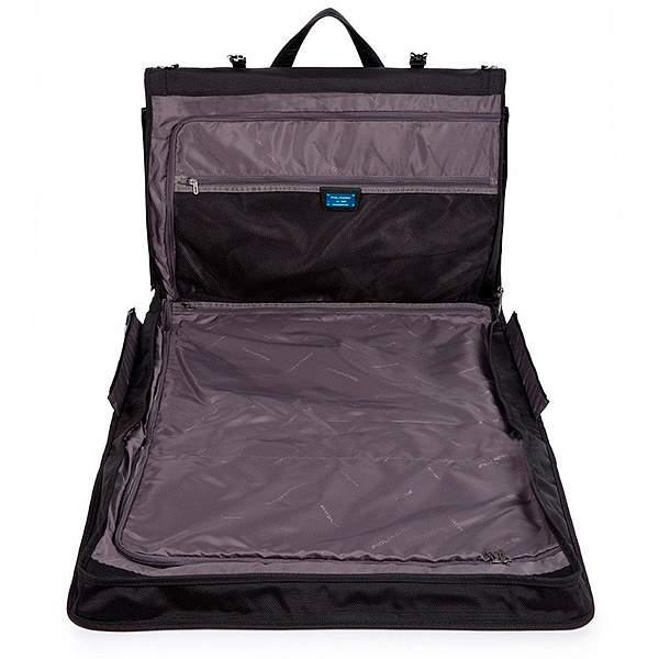 Стильный и функциональный портплед для костюма из коллекции Piquadro Brief. Изготовлен из износостойкого нейлона с кожаной отделкой. Имеет одно отделение с фиксирующими ремнями для костюма, внутренний и внешние карманы на молнии, ручки и съемный плечевой ремень для удобной транспортировки. Габариты портпледа подходят для провоза в салоне самолета в качестве ручной клади. На задней части предусмотрено крепление на ручку чемодана. Очень полезный аксессуар для путешествий и бизнес-командировок.