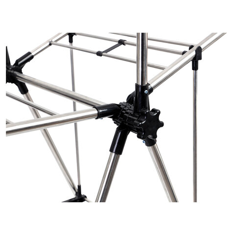 Сушилка для белья изготовлена из высококачественных прочных материалов, что обеспечивает ее устойчивость и мобильность. Все углы сушилки плавно и аккуратно скруглены. Ножки оснащены пластиковыми накладками для защиты пола от царапин и предотвращения скольжения сушилки по поверхности.