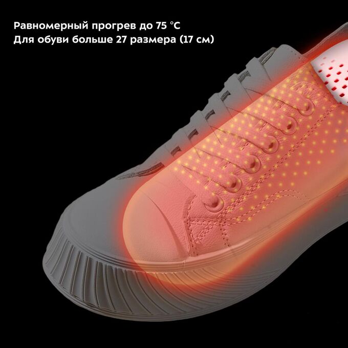Конструкцией предусмотрено большое количество отверстий, позволяющие равномерно распределять по всему объему тепло до 75°С. Устройство плотно фиксируется в обуви более 27 размера. При необходимости под крышку корпуса сушилки можно подкладывать губку с парой капель эфирных масел, которые придают обуви легкий приятный аромат. Длина сетевого шнура равна 1,4 м.
