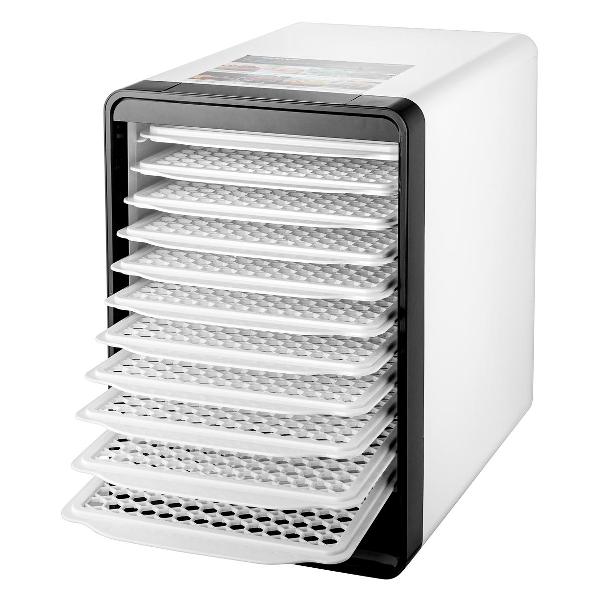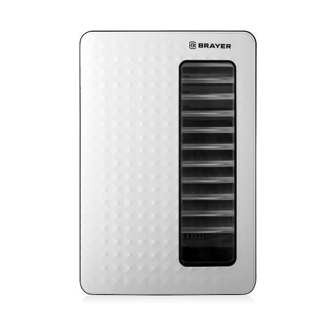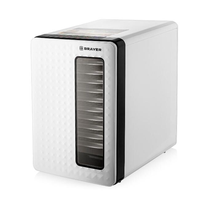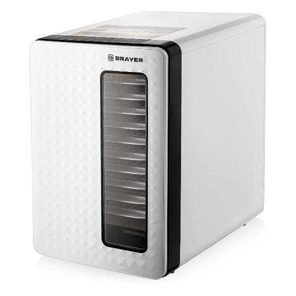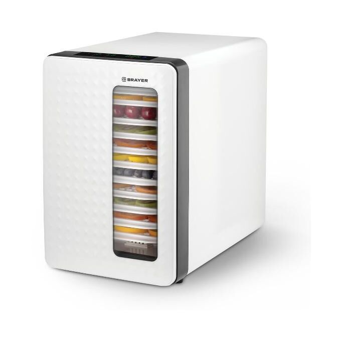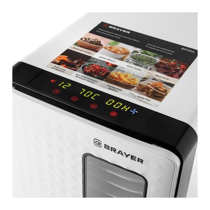 Сушка для фруктов Brayer BR1904 оснащена полностью закрытым корпусом, который включает в себя десять плоских поддонов и сетку для размещения мелких продуктов. Полезный объем составляет 13 л. За управление отвечает сенсорная панель на корпусе и электронный дисплей, на котором отображаются индикаторы включения и температуры нагрева. Благодаря встроенному таймеру прекращение программы высушивания произойдет в заданное время.