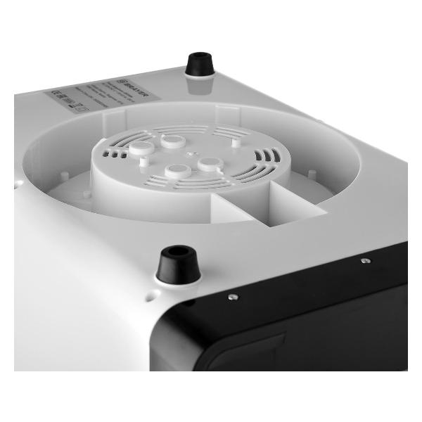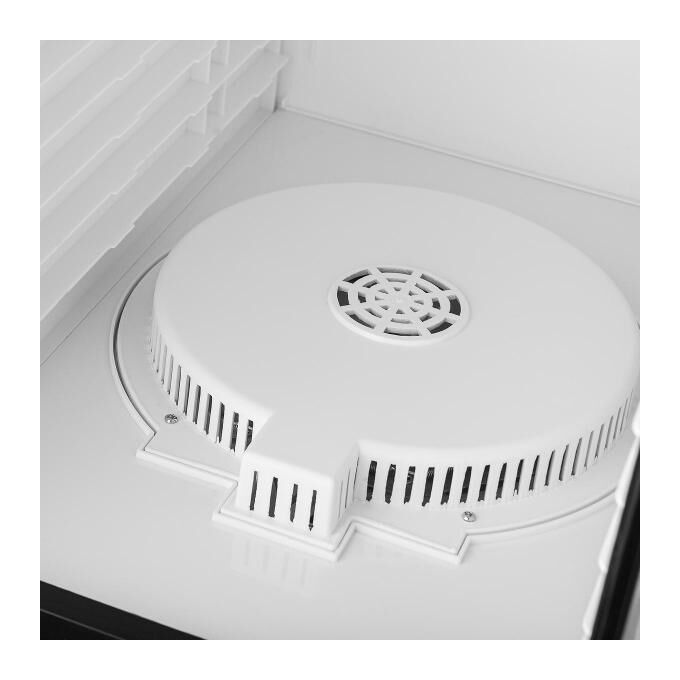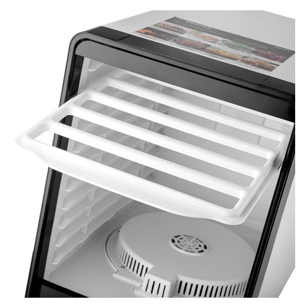 Предусмотрена возможность регулировки степени нагрева в диапазоне от 40°С до 70°С. Встроенный вентилятор обеспечивает активную циркуляцию воздуха между поддонами. Функционал устройства включает в себя сушку фруктов, овощей, ягод, рыбы, мяса, грибов и трав. Конфигурацией данной модели предусмотрено наличие функции отключения при возникновении перегрева.