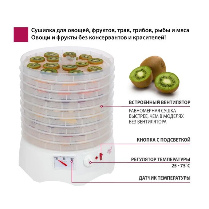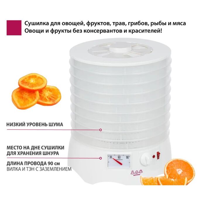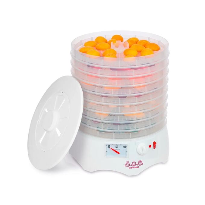 Сушилка для овощей и фруктов Мастерица 6 прозрачных поддонов + 3 белых поддона в подарок. Мощность 280Вт, 9 поддонов, Биметаллический термометр показывает температуру сушки.