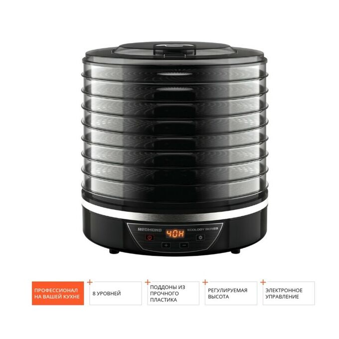 REDMOND FD1103 – современный дегидратор для сушки овощей, фруктов и грибов, а также приготовления пастилы. Сушилка имеет 8 широких поддонов, таймер на 72 часа, регулируемую высоту и электронное управление со светодиодным дисплеем. 8 уровней Поддоны выполнены из прозрачного материала, чтобы вы могли отслеживать ход сушки. Рифленая перфорированная поверхность ускоряет процесс высушивания. Поддоны из высокопрочного пластика Уровни сушилки сделаны из прочного и безопасного пластика, стойкого к нагреву.