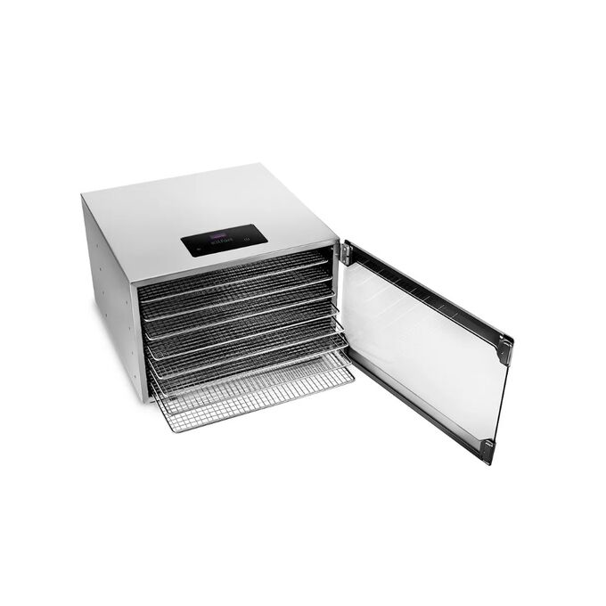 Электрическая сушилка предназначена для сушки овощей, фруктов, ягод, грибов, корнеплодов, трав и зелени, а также мяса и рыбы, хлеба. Сушилка имеет в комплекте 8 поддонов для сушки и 1 поддон для жидкости. Поддоны для сушки выполнены из нержавеющей стали. В сушилке установлен мощный нагревательный элемент и вентилятор большого диаметра, обеспечивающий равномерное распределение нагретого воздуха по всему объему камеры. Благодаря горизонтальному обдуву смешение запахов при сушке одновременно разных продуктов минимально. На сушилке можно установить температуру сушки в диапазоне 35–80 оС с шагом 1 градусов. Сушилка оснащена таймером до 24 часов работы с шагом 30 минут.