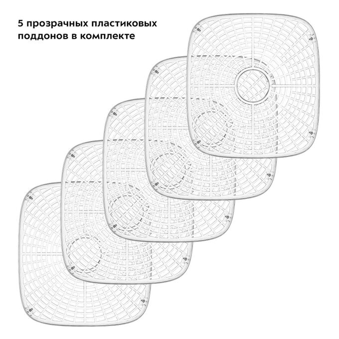 Сушилка имеет в комплекте 5 поддонов из пластика и крышку. Благодаря прозрачным поддонам вы сможете наблюдать за процессом сушки.