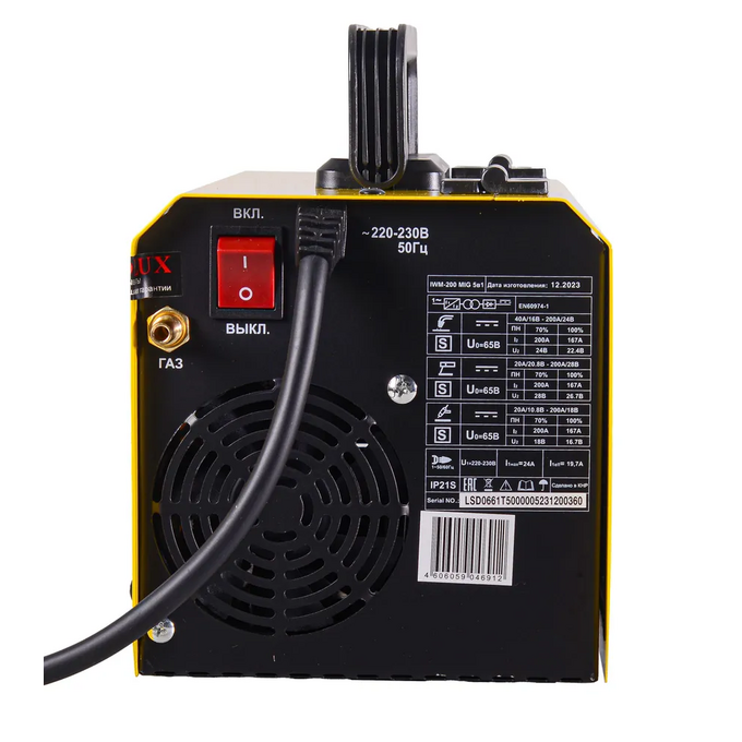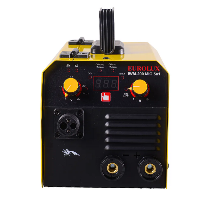 Сварочный полуавтоматический инверторный аппарат Eurolux IWM-200 MIG 5в1 относится к категории полупрофессиональных и подходит для применения не только в быту, но и на производстве, на стройке, в автомастерской. Панель управления включает в себя выбор режима сварки, регулятор напряжения или величины сварочного тока, а также форсажа дуги, настройку скорости подачи проволоки и клемма для выбора полярности. В модели Eurolux IWM-200 MIG 5в1 съемная горелка, к ней в комплекте поставки прилагаются 2 наконечника 0,8 и 1 мм. Для простого поджига и высокой стабильности дуги предусмотрены функции Hotstart, Antistick и Arcforce.