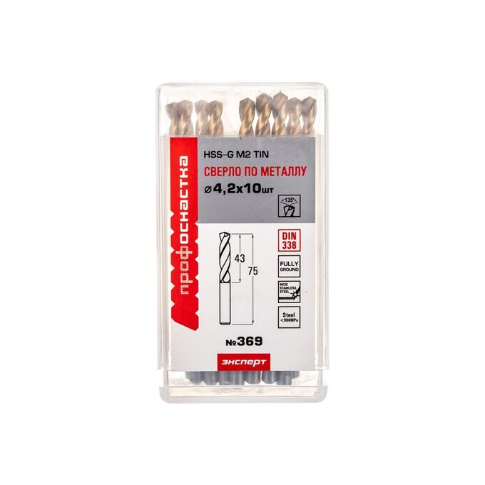 Сверло по металлу №369 Профоснастка Эксперт 30202049 4,2 мм P6M5 HSS M2 TIN 6542 135 DIN 338, 1шт. - упак. в пласт. бокс по 10 шт.