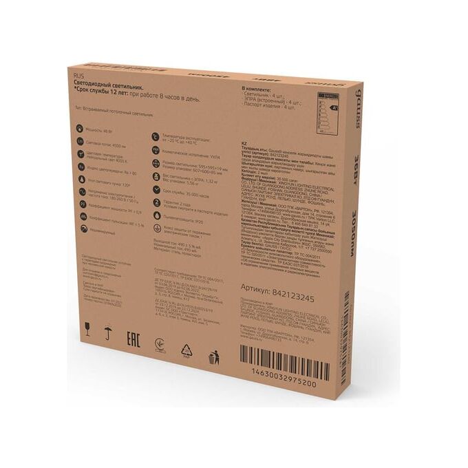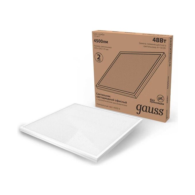 Технические характеристики Gauss 595x595x19мм 45W 4100lm 4000K призм. рассеиватель 842123245