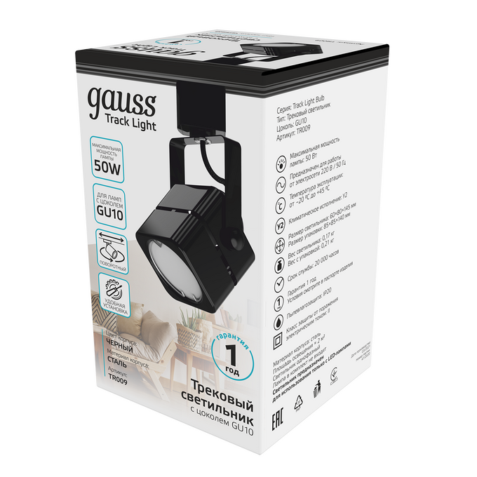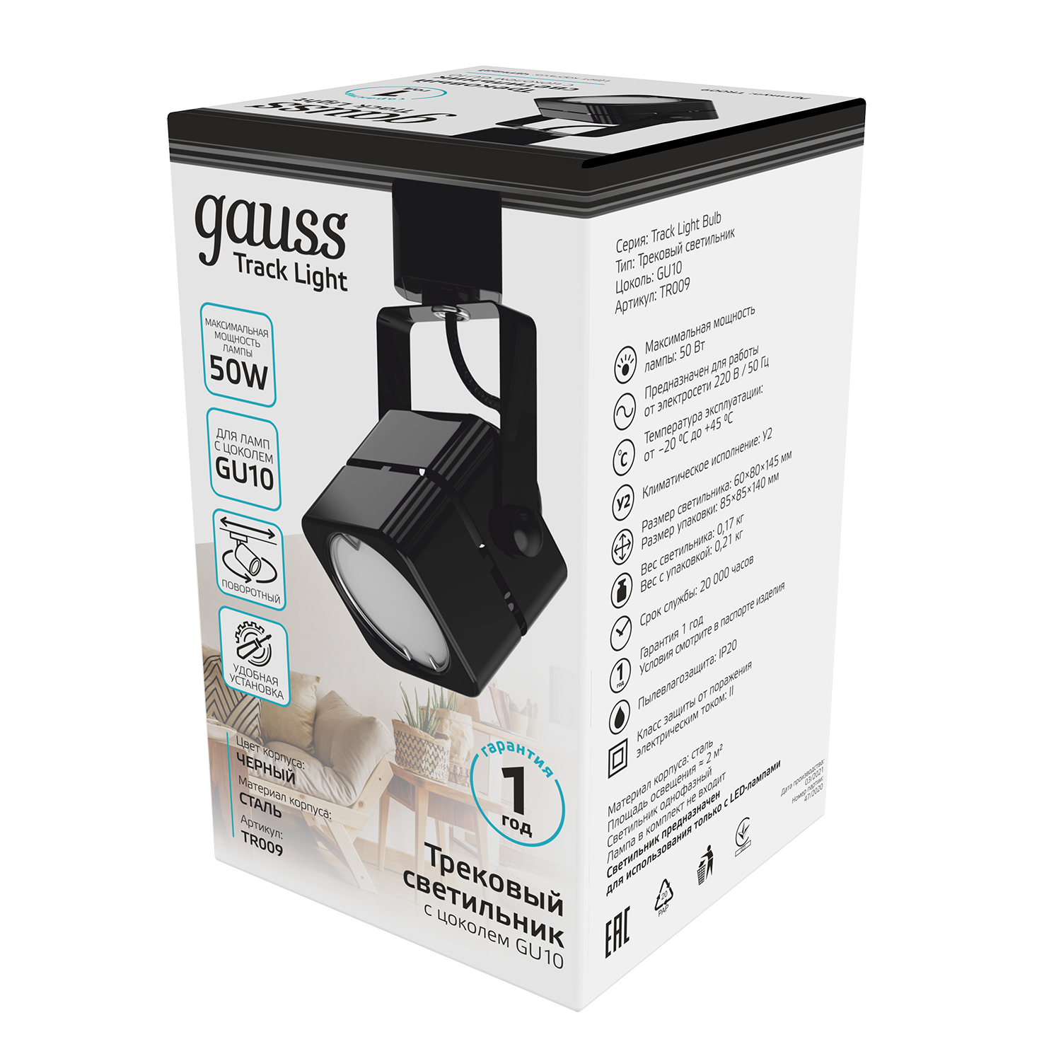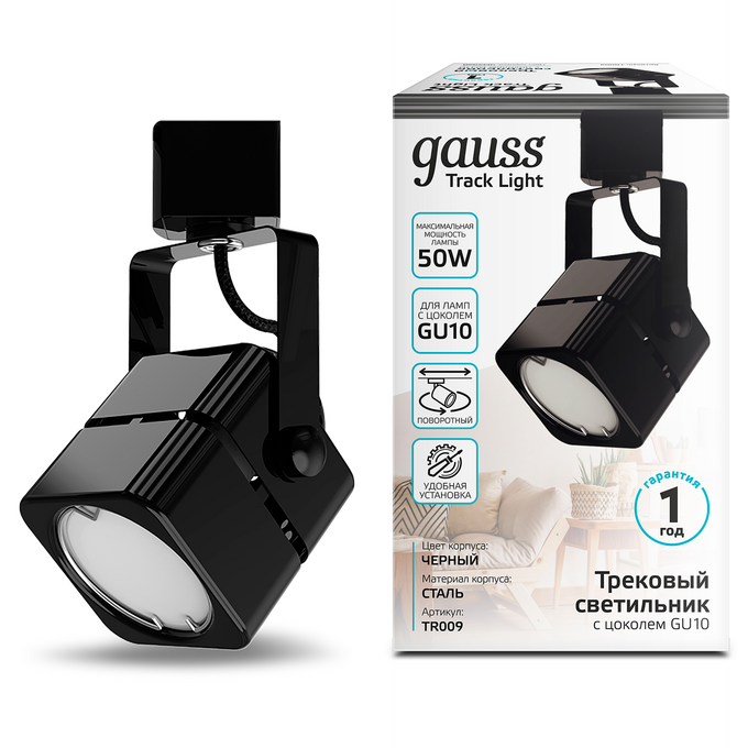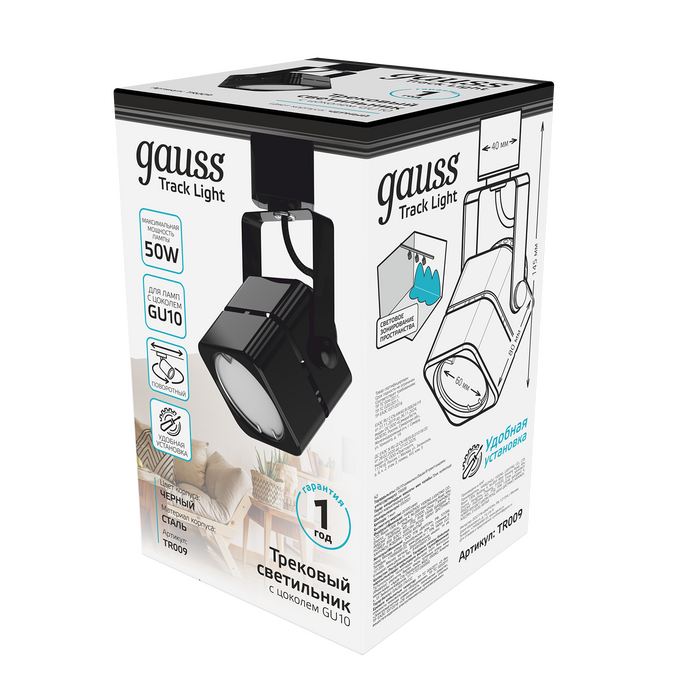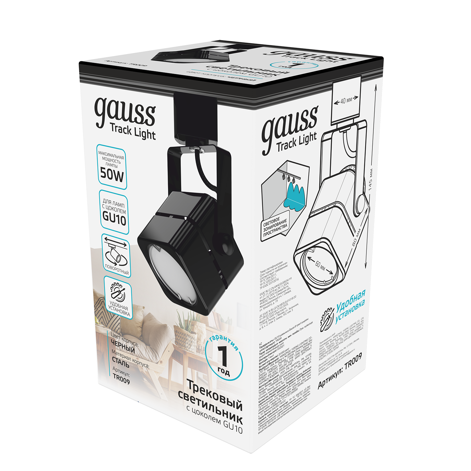Светильник трековый Gauss куб GU10 TR009 изготовлен из стали и покрыт черной эмалью. Параметры у него соответствуют стандартам для сухих жилых помещений: IP20; угол светового пучка 41-80°; цоколь GU10, мощность устанавливаемой лампы до 50w. Благодаря тому что он настраивается в вертикальных и горизонтальных плоскостях и совместим с трековой системой Gauss, его можно применять во всех вариантах комплексной подсветки и в единичных световых акцентах.