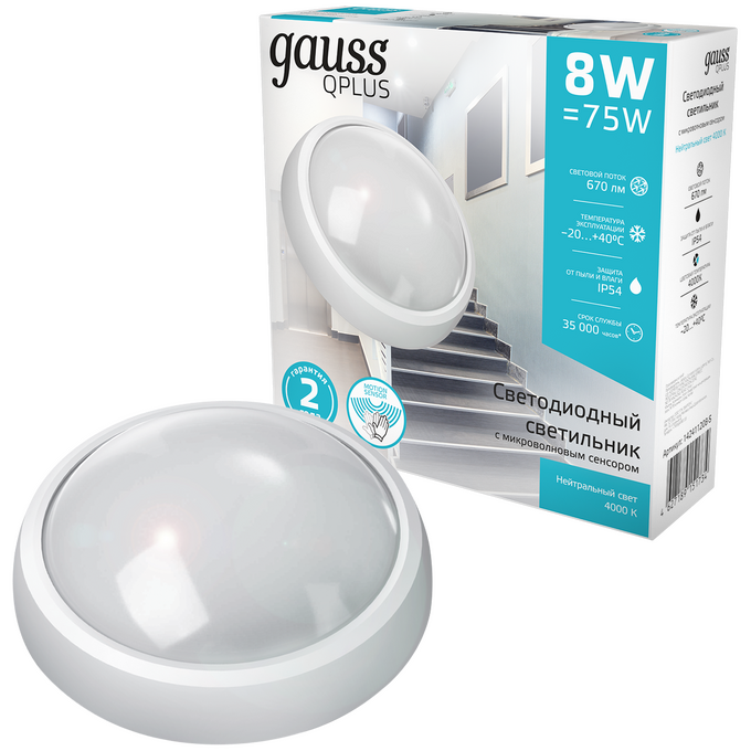 Светильник Gauss ЖКХ 142411208-S 8Вт 4000K белый опал датч.движения