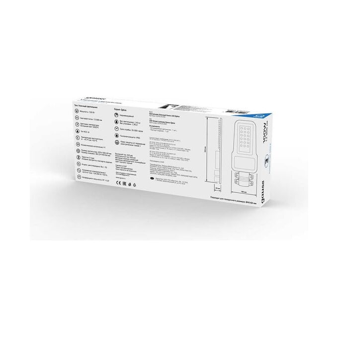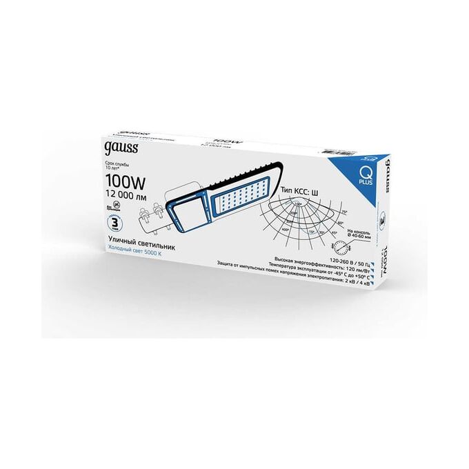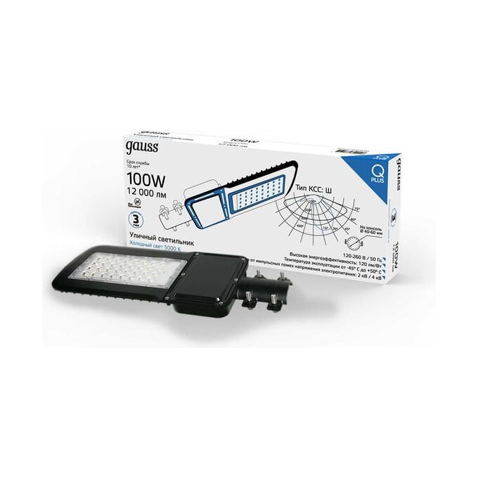 Светильник уличный консольный Gauss LED Qplus КСС "Ш" 100 W - новое слово в освещении больших территорий. Высокая эффективность в 120 лм/Вт плюс широкое светораспределение позволят максимально осветить как технические площадки: автостоянки, участки дорог, стройплощадки, склады; так и жилые: дворы, игровые площадки, зоны подъезда к территории, ландшафт, подсветка зданий. Высокая степень защиты от влажности IP65, крепкий ударопрочный корпус из литого алюминия, покрытого антикоррозийной краской, дают возможность широко применять консольный светильник Gauss LED Qplus КСС "Ш" в уличных сценариях.