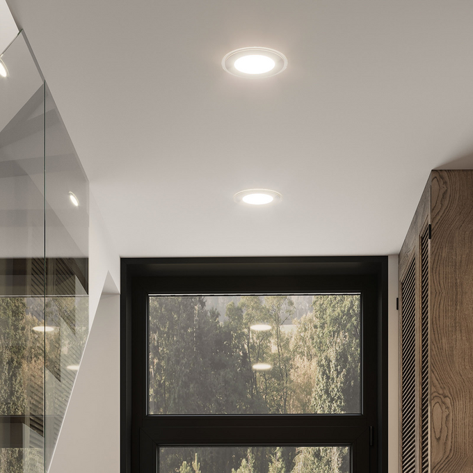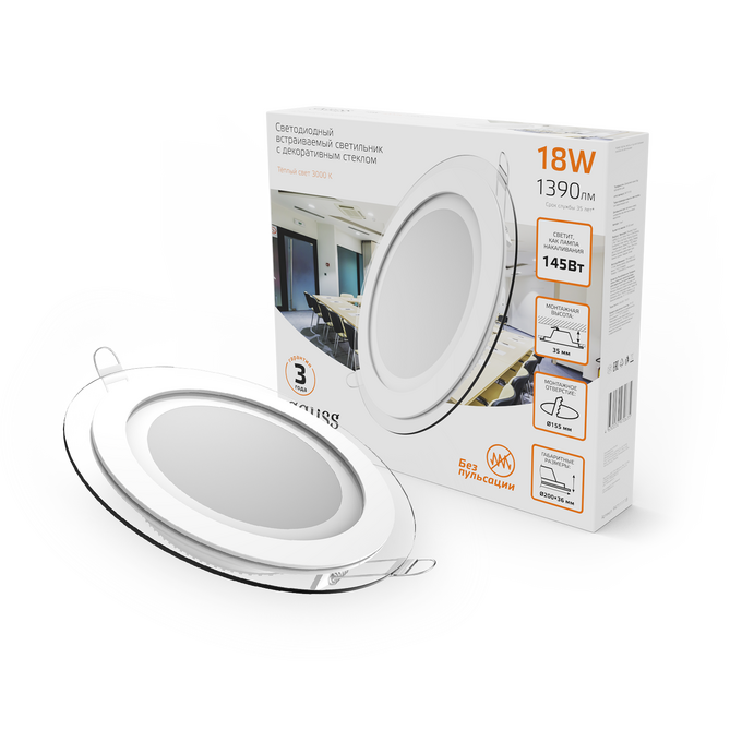 Светильник встраиваемый Gauss Downlight круг с декоративным стеклом и декоративным световым контуром. Мощность 18w, светит как лампа накаливания 145w, цветовая температура 3000К (теплый белый свет), световой поток 1390лм. Корпус выполнен из алюминия, окрашенного в белый цвет. Нейтральный лаконичный дизайн светильника найдет применение на всех видах натяжных, гипсокартонных или реечных потолков с глубиной просадки не менее 3.5см. Низкая пылевлагозащита исключает использование светильника в ванной, душевой и парной комнатах.