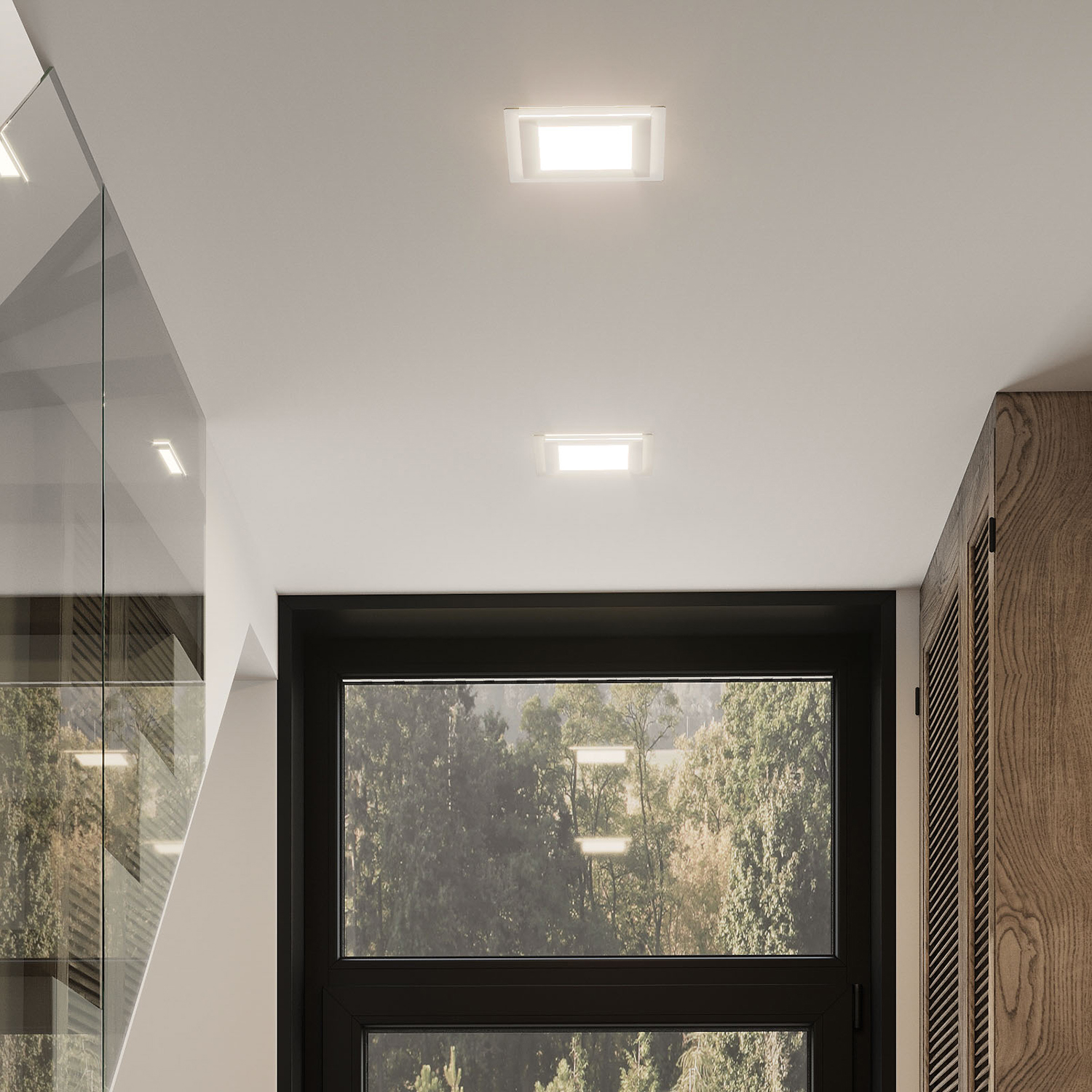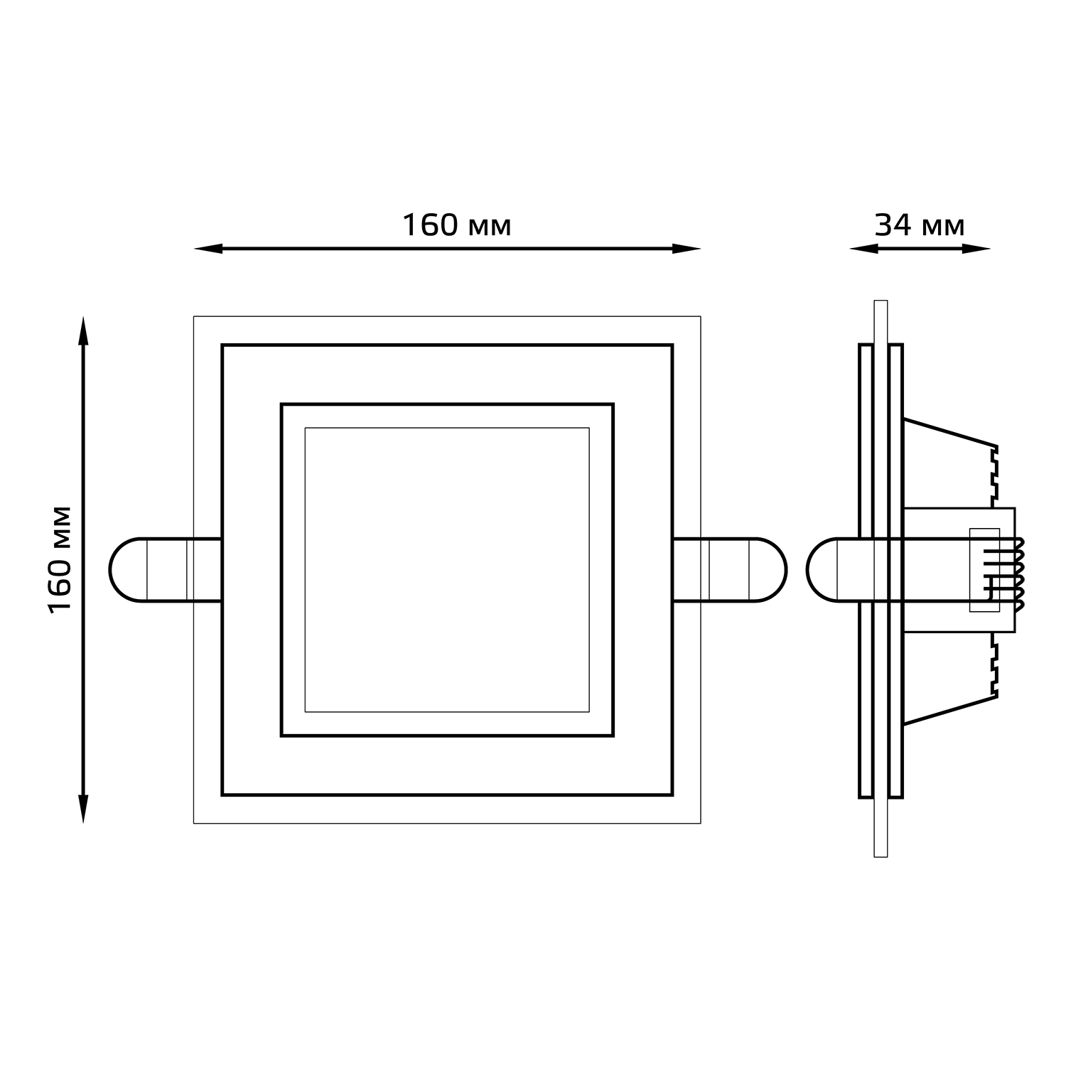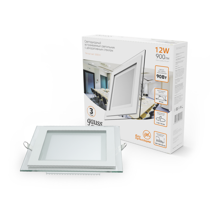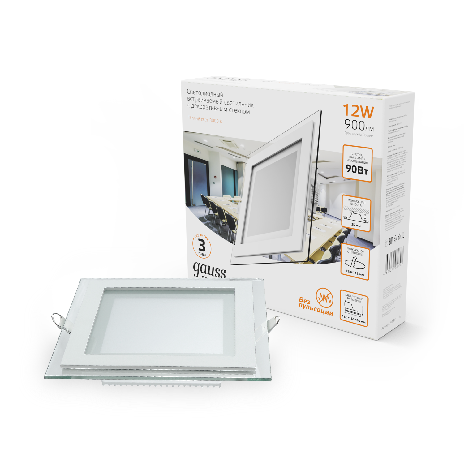 Светильник встраиваемый Gauss Downlight квадрат с декоративным стеклом, создает дополнительный световой эффект по контуру светильника. Его мощность составляет 12w, что соответствует лампе накаливания 90w. Цветовая температура 3000К (теплый белый свет), мощность светового потока 900лм. У светильника имеется алюминиевый радиатор на задней стенке для максимального отведения температуры. Он может применяться на всех видах натяжных, гипсокартонных или реечных потолков с глубиной пространства не менее 3см. Пылевлагозащита IP20.