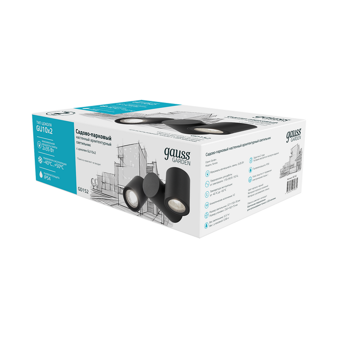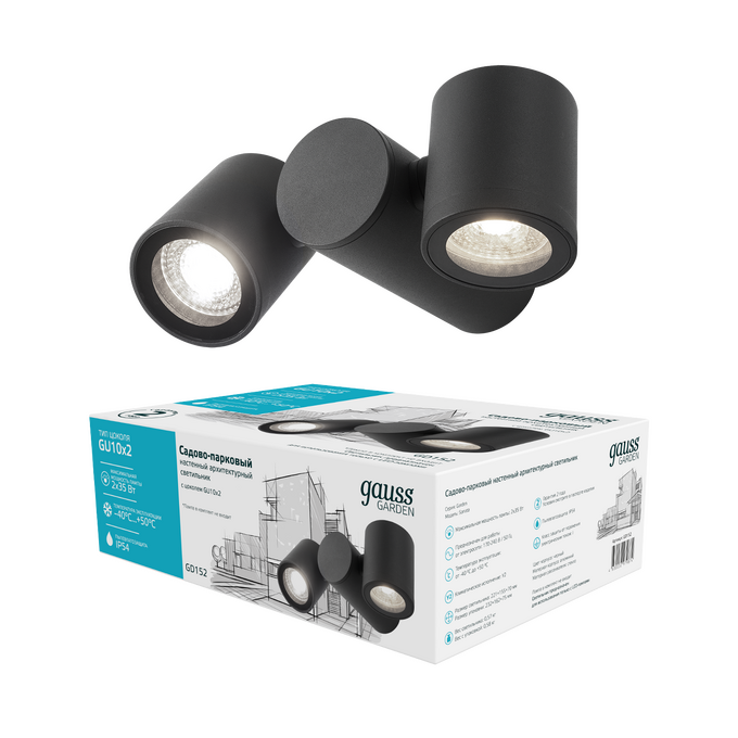 Светильник садово-парковый Gauss Sonata архитектурный настенный с двумя спотами на коротком столбике - это симпатичный и практичный элемент вашего двора или сада. Он прекрасно впишется в любой современный экстерьер фасадов жилых или коммерческих зданий. У него антикоррозийное порошковое напыление на алюминиевом корпусе и закаленное стекло рассеивателя. Допустимая мощность не должна превышать 60Вт( 2по 35вт), IP 54 - работа на открытых пространствах, а диапазон максимальных температур от -40 до +50°С позволяет освещать ваше пространство даже в экстремальных условиях.