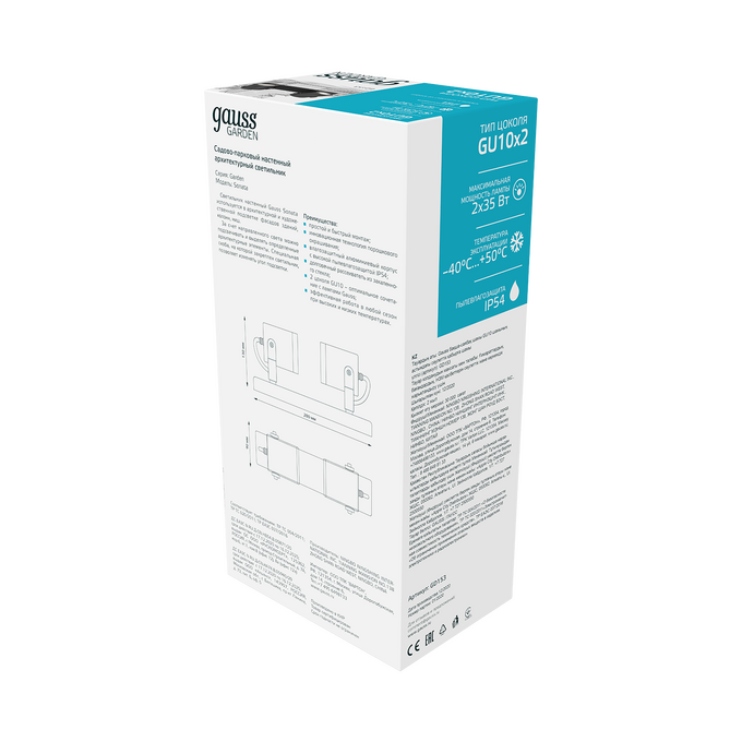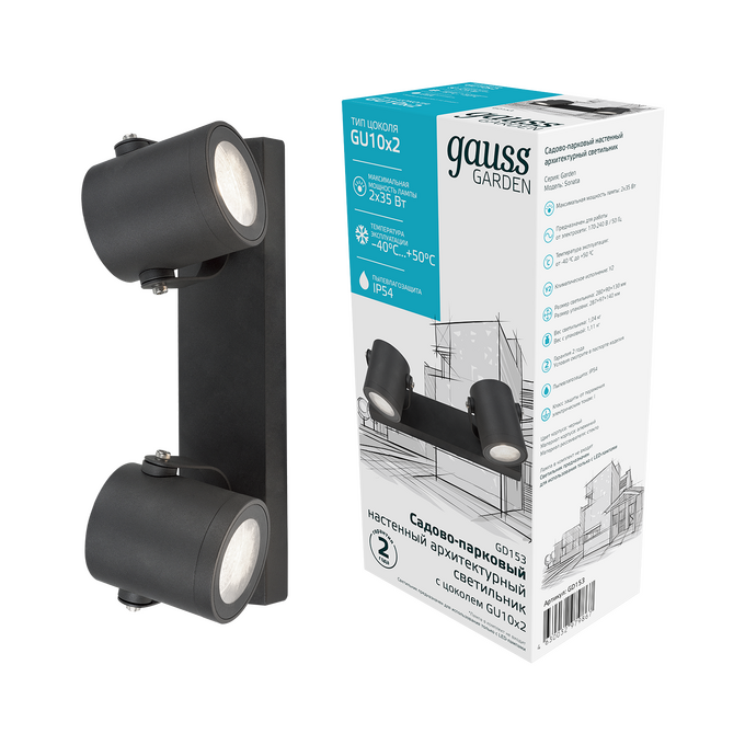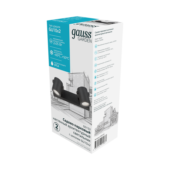 Светильник садово-парковый Gauss Sonata архитектурный настенный с двумя разведенными на панели спотами и поворотными скобами очень пластично может выделять ландшафтно-архитектурные элементы сада и патио и устанавливаться на фасады дома, веранды, беседок, пергол. Он изготовлен из покрытого антикоррозийной порошковой краской алюминия. Максимальная мощность ламп до 60Вт (2 по 35вт), с патронами для ламп GU10. Материал рассеивателя - закаленное прозрачное стекло. Уровень пылевлагозащиты IP54 позволяет не опасаться устанавливать светильники на открытых пространствах в любые времена года.