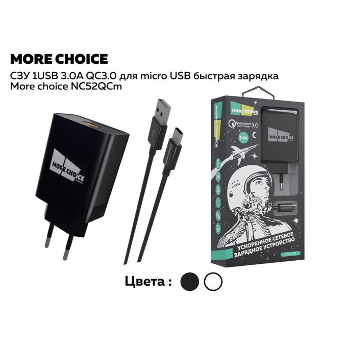 СЗУ 1USB 3.0A QC3.0 для micro USB быстрая зарядка More choice NC52QCm (Black)