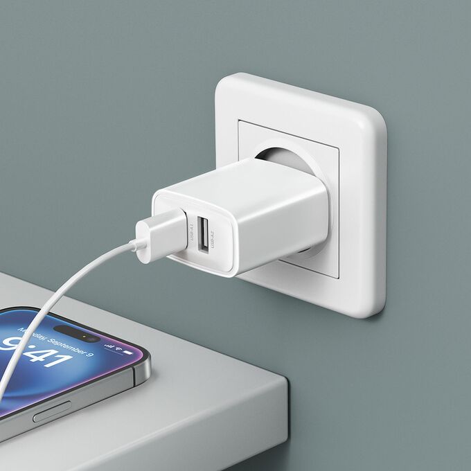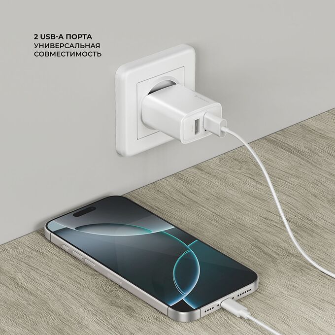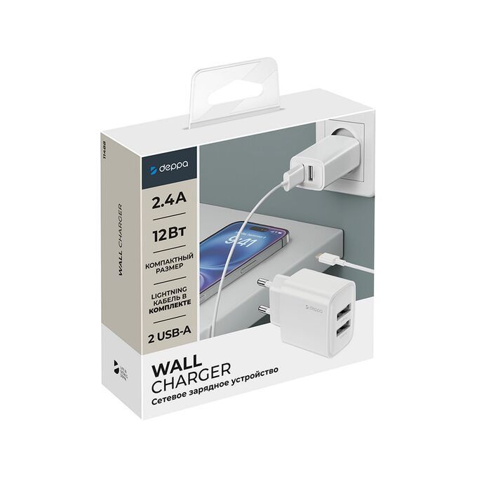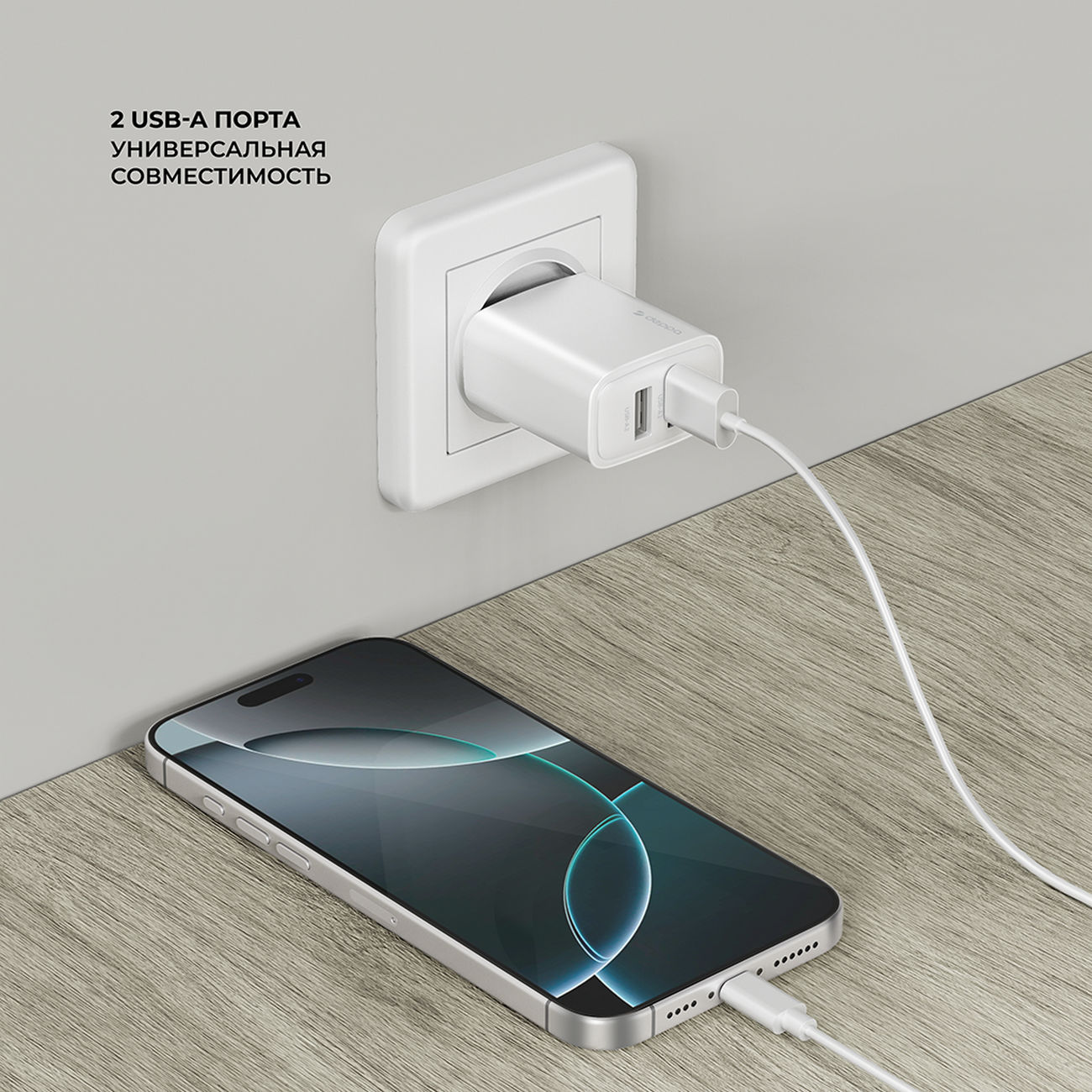 СЗУ 2хUSB-A, 2.4A, дата-кабель Lightning 1м, белый, Deppa