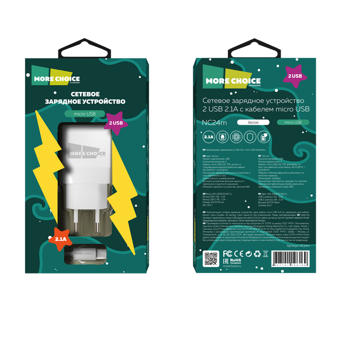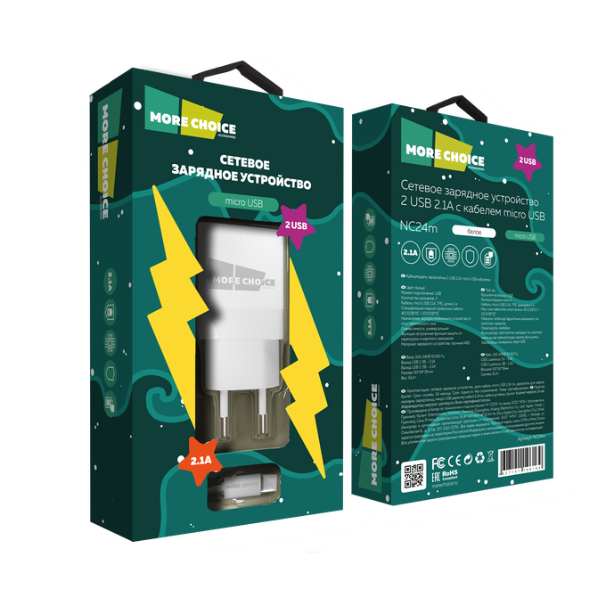 СЗУ 2USB 2.1A для micro USB More choice NC24m (White)