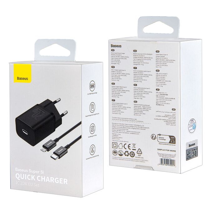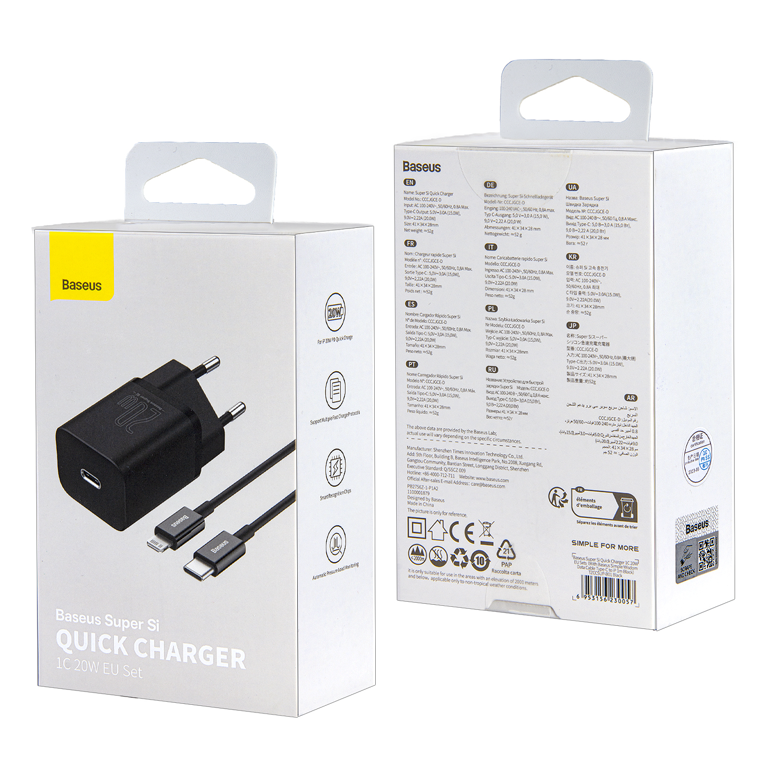 Baseus Super Si Quick Charger 1C – компактное сетевое зарядное устройство, поддерживающее быструю зарядку по протоколам Quick Charge 3.0, Power Delivery 3.0 и другим. Оно оснащено одним выходным разъемом USB Type-C и поддерживает мощность 20 Вт. Подойдет и для быстрой зарядки смартфона, и для питания беспроводного зарядного устройства. Встроенный интеллектуальный чип автоматически подбирает необходимое напряжение и ток для каждого подключаемого мобильного аппарата. В комплекте к нему идет кабель Type-C - Lightning.