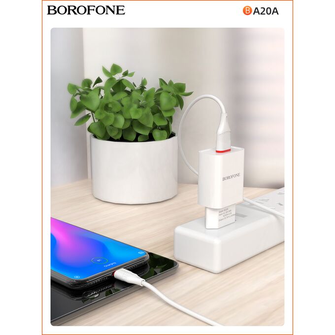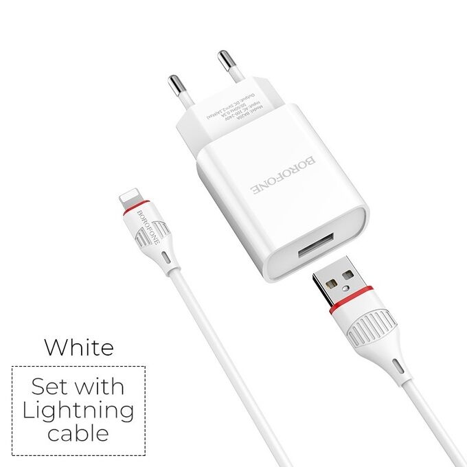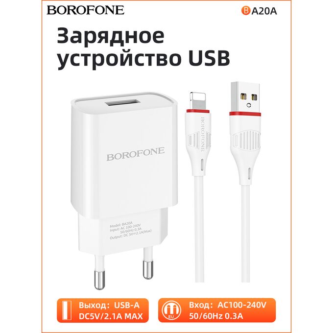 СЗУ Borofone BA20A 5V/2,1A 1USB Sharp single port + lightning cable, white
