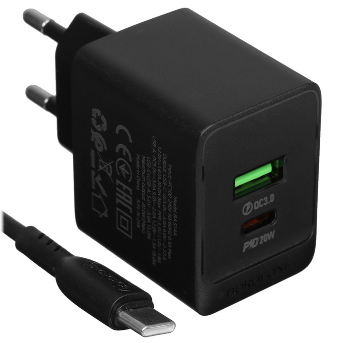 СЗУ Borofone BAS14A 1USB+1Type-C 3.0A QC3.0 PD 20W быстрая зарядка Black