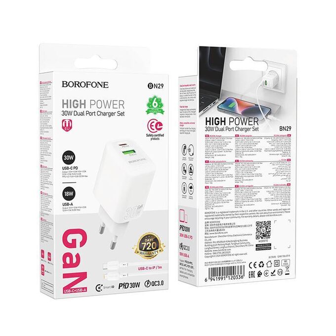 СЗУ BOROFONE BN29 Fuente PD30W+QC3.0 charger set(C to C) (белый)