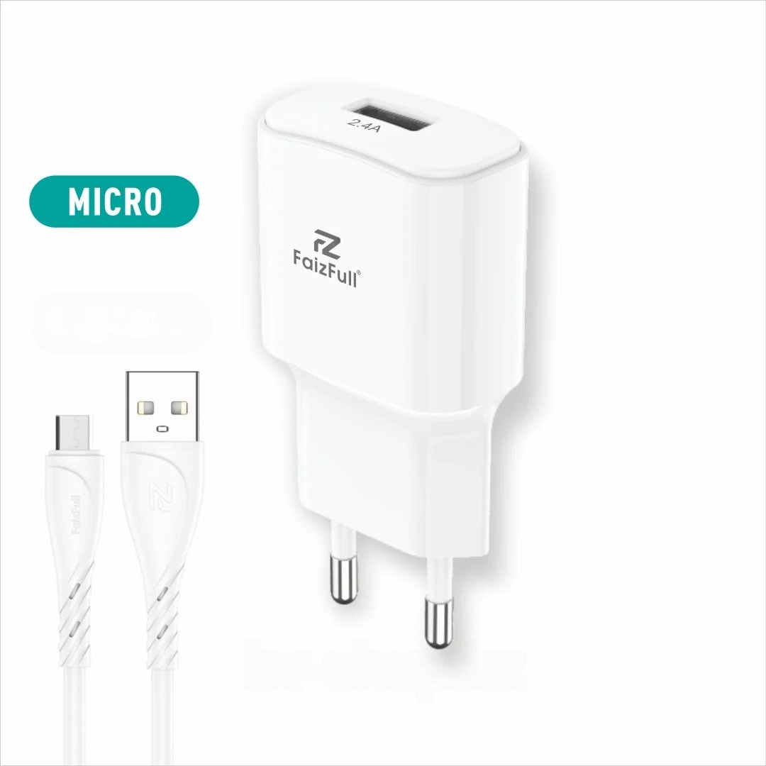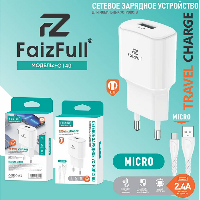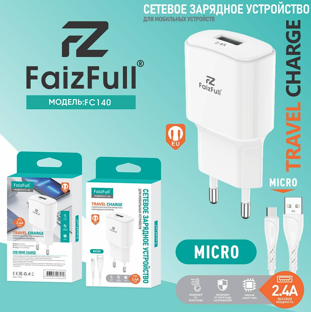 СЗУ FaizFull FC140 1USB 2,4А + кабель Micro USB Белый