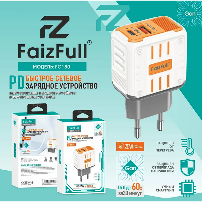Сетевое зарядное устройство FaizFull FC180 — компактное решение для одновременной зарядки двух гаджетов. Оснащено двумя портами: USB и Type‑C, суммарная мощность — 20 Вт. Поддерживает стандарты быстрой зарядки Power Delivery (PD) и Quick Charge 3.0. Белый корпус выполнен из прочного пластика, дизайн универсальный — подойдёт для дома, офиса или путешествий. Совместимо с iPhone, смартфонами на Android (Samsung, Xiaomi, Huawei и др.), планшетами и наушниками. Имеет защиту от перегрева, короткого замыкания и перепадов напряжения. Интеллектуальная система Smart‑ID автоматически определяет оптимальный ток зарядки. Гарантия 6 месяцев.