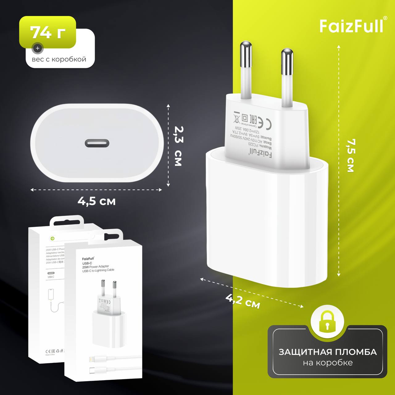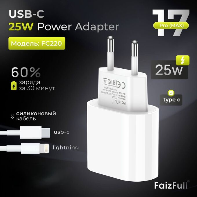 Сетевое зарядное устройство FaizFull FC220 с кабелем Type-C to Lightning — компактный комплект для быстрой зарядки устройств с разъёмом Lightning. Поддерживает стандарт Power Delivery (PD) 25 Вт, что позволяет быстро заряжать iPhone, AirPods, iPad и другие гаджеты.