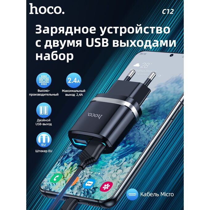 СЗУ HOCO C12, 2USB, 2.4A + Micro (черный)
