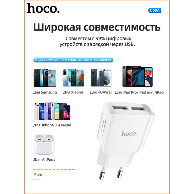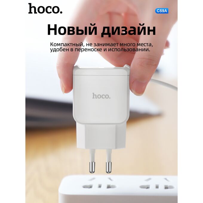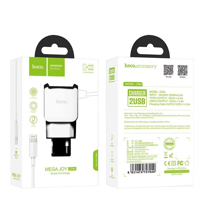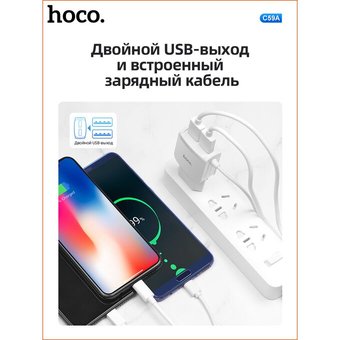 СЗУ HOCO C59A Mega joy 2USB, встроенный кабель Lightning, 2.1A (белый)