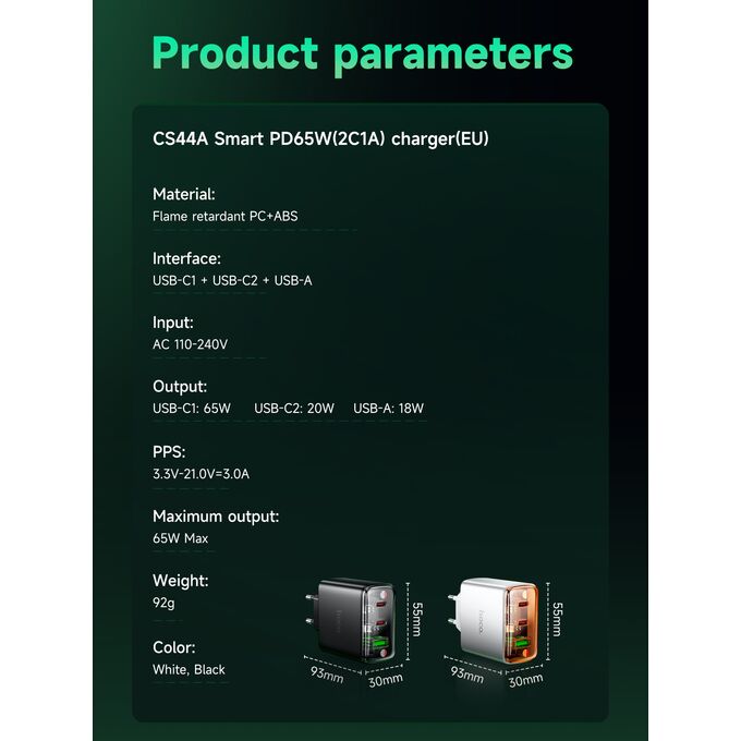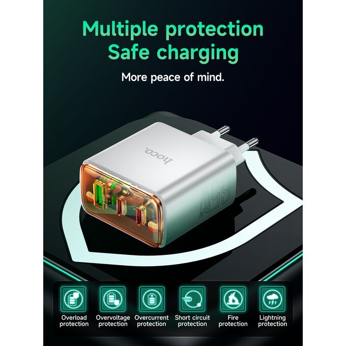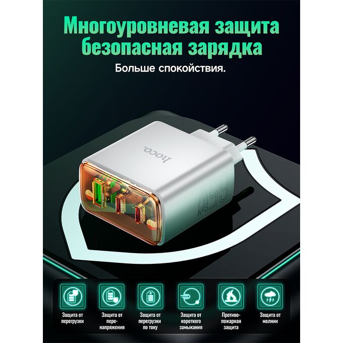Зарядное устройство Hoco Smart PD65W обладает качествами более стабильной зарядки, более быстрым рассеиванием тепла, большой мощностью на выходе и маленьким размером.