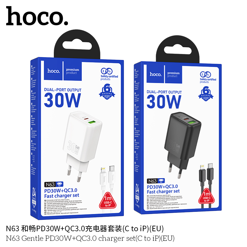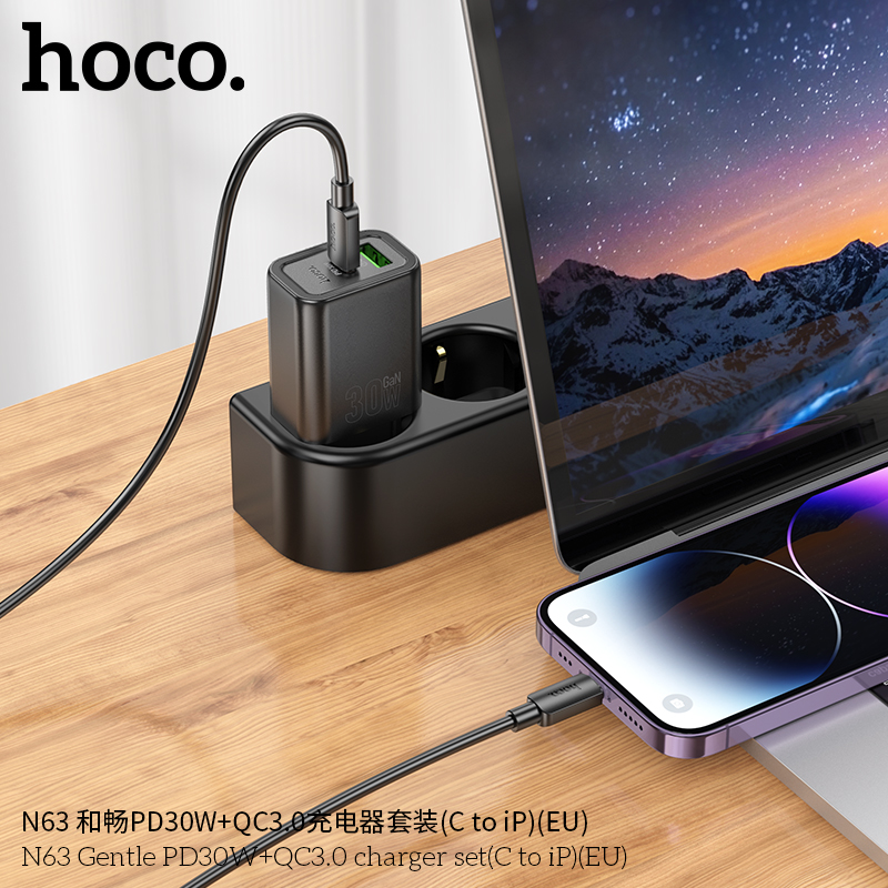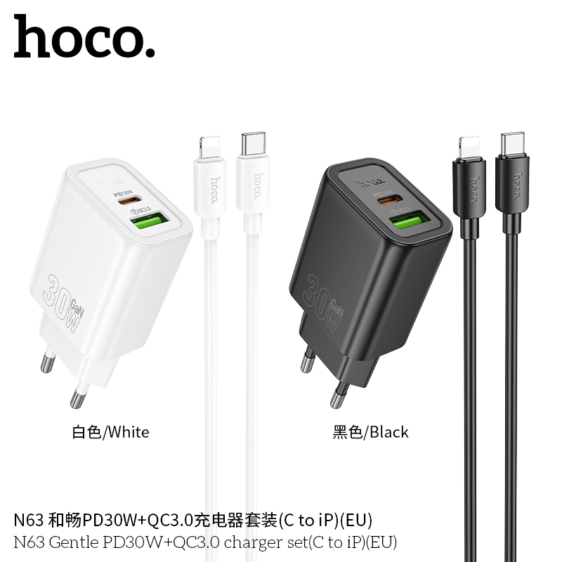 СЗУ HOCO N63 Gentle PD30W+QC3.0 + cabel Type-C to iP (черный)