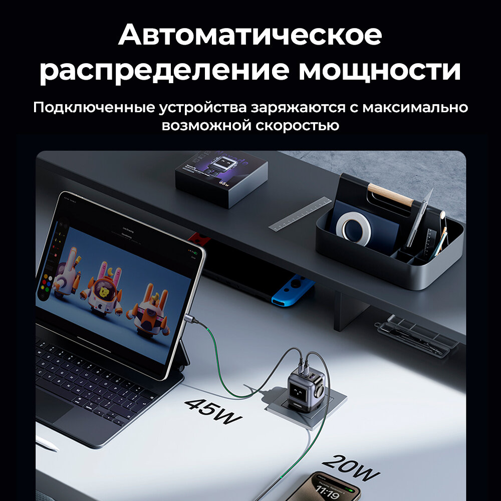 СЗУ UGREEN CD361 (25685B) USB-A+2*USB-C 65W Nexode Robot GaN Tech Fast Charger Gray