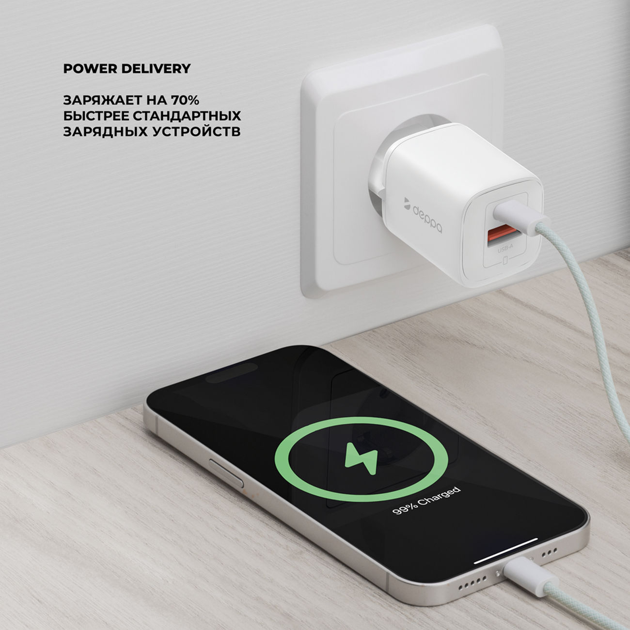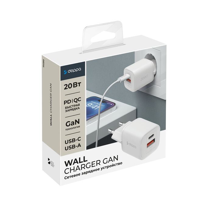 СЗУ USB-C + USB-A, PD 3.0, QC 4.0+, 20W, GaN, белый, Deppa