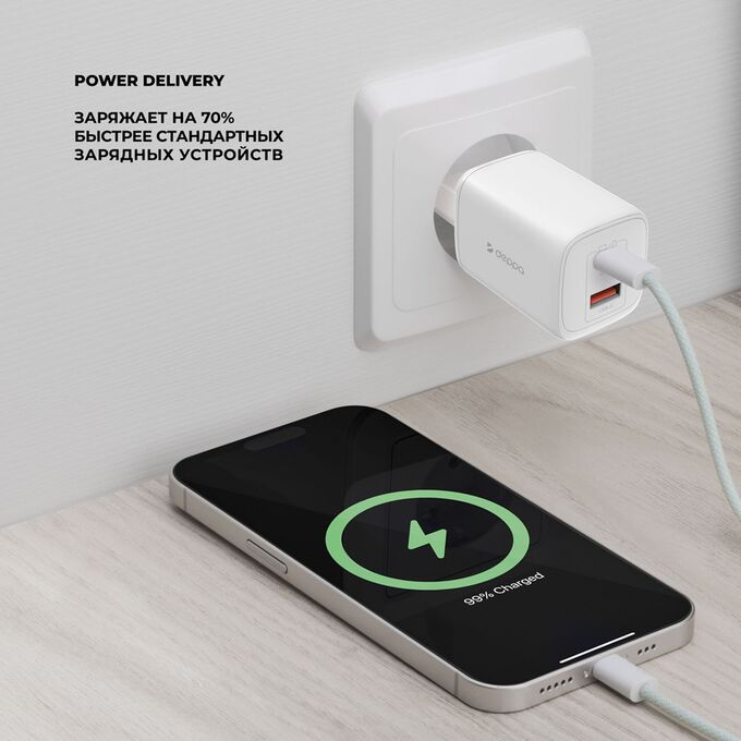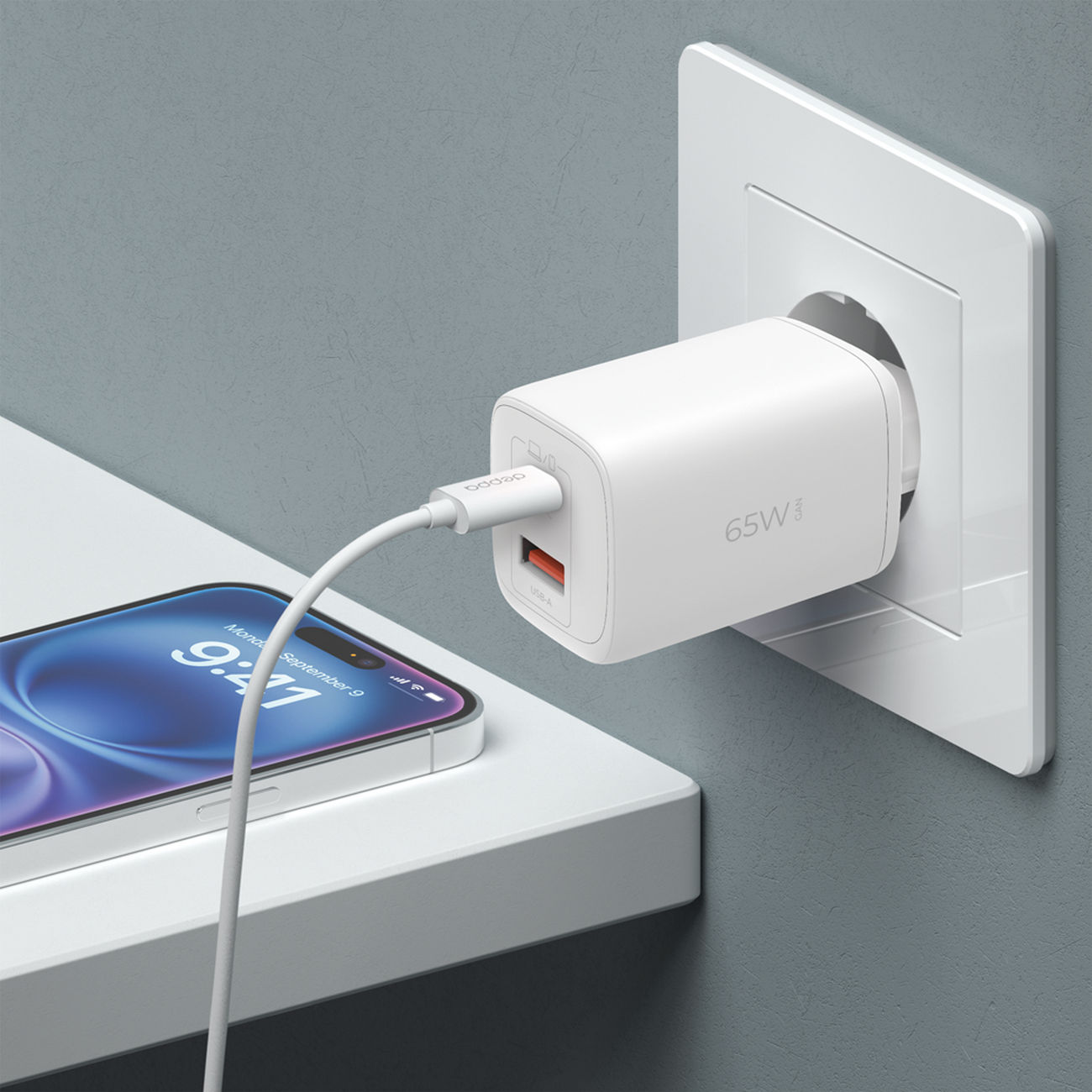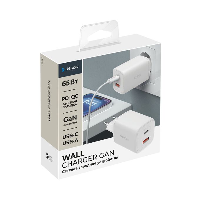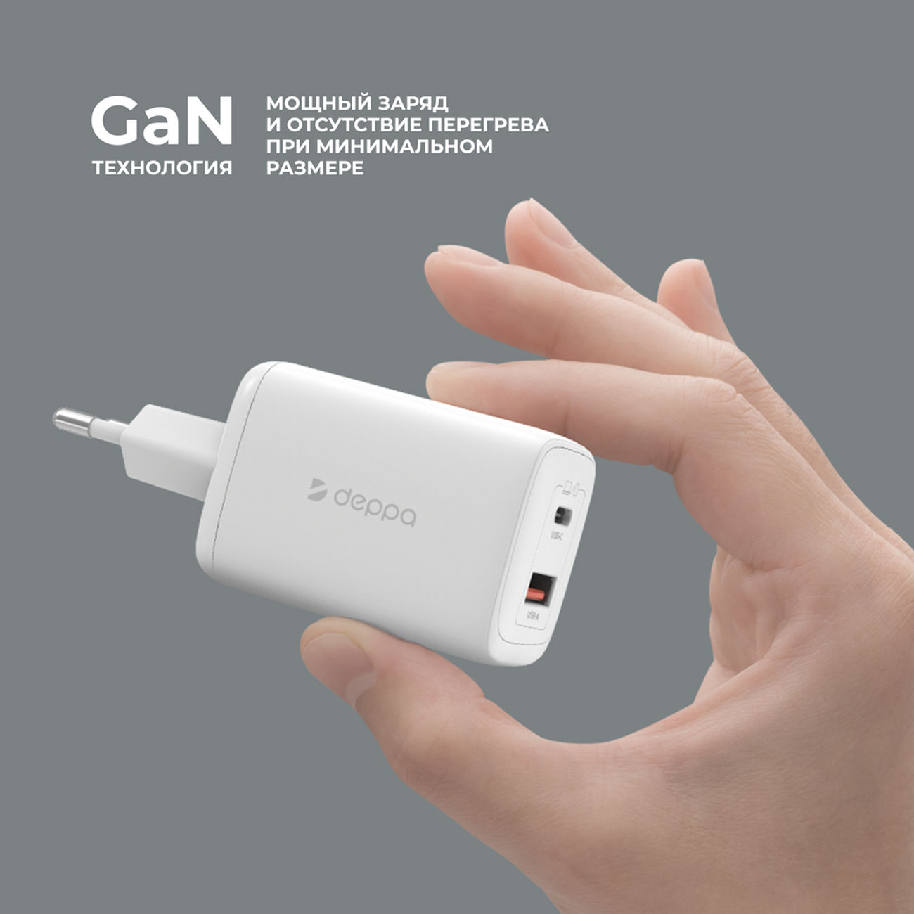 СЗУ USB-C + USB-A, PD 3.0, QC 5.0, 65W, GaN, белый, Deppa
