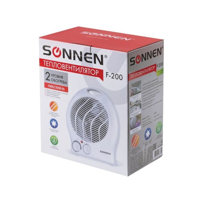 SONNEN F-200, 1000/2000 Вт, 2 режима работы, белый, 453493 имеет защиту от перегрева.